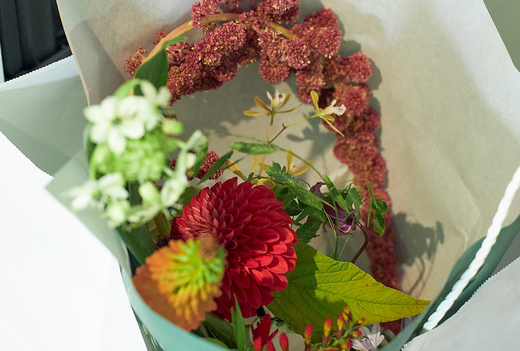 お花を活けたあとは、ご自宅で活け直しが出来るよう花束に。アトリエ・エムオーで感じた感覚を共にお持ち帰りいただきます。この機会が、みなさんの生活が豊かになるきっかけになれたら嬉しく思います。