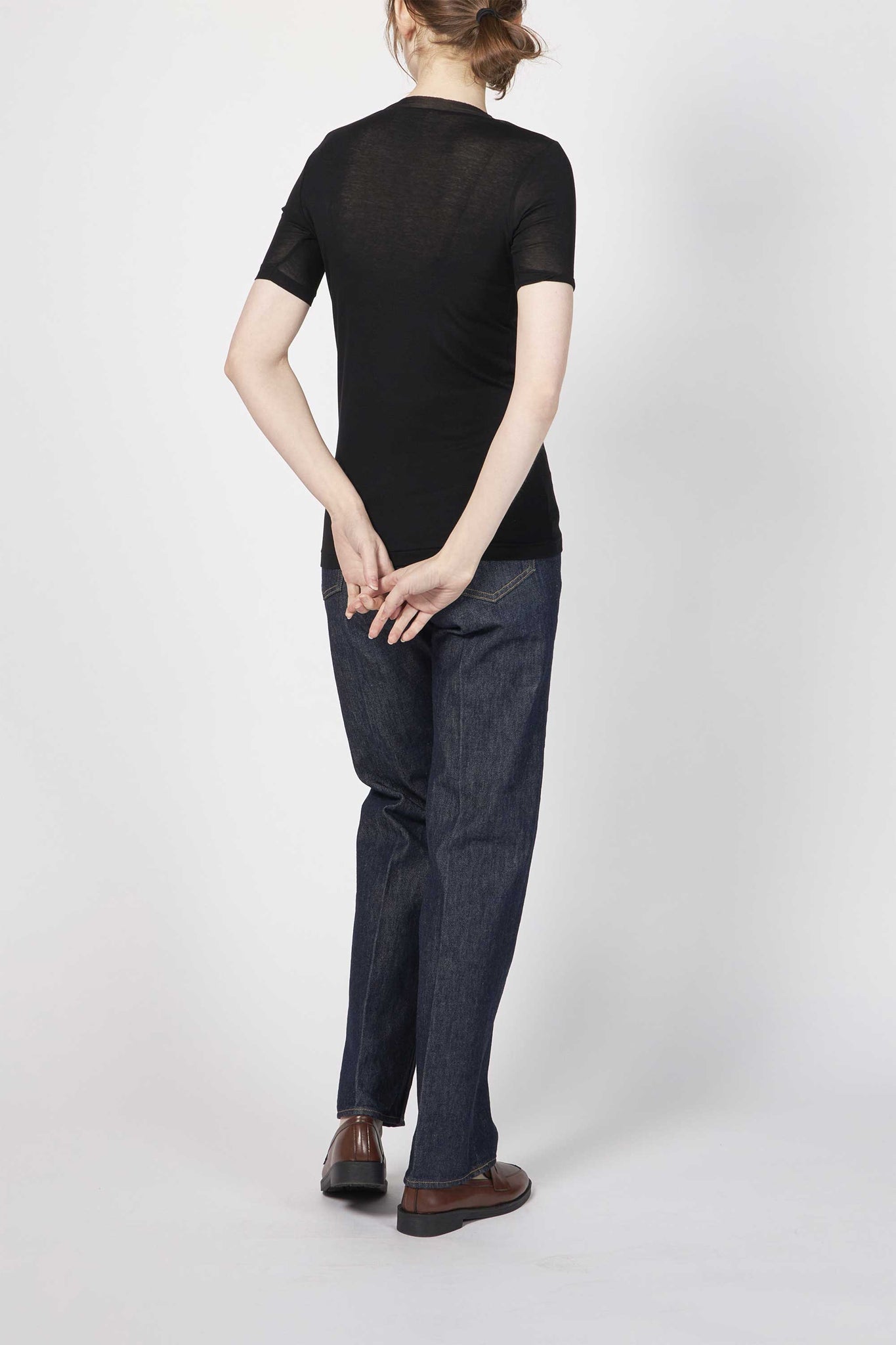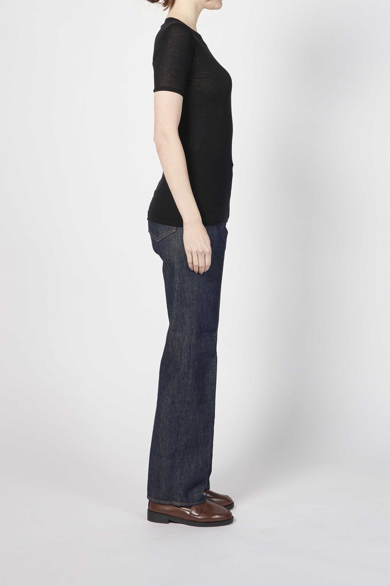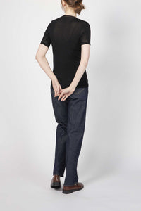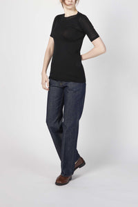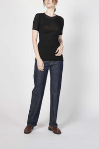 希少な編み機でハイゲージに編み上げたリブ素材は、驚くほど薄く軽やかで、繊細な透け感が特徴です。