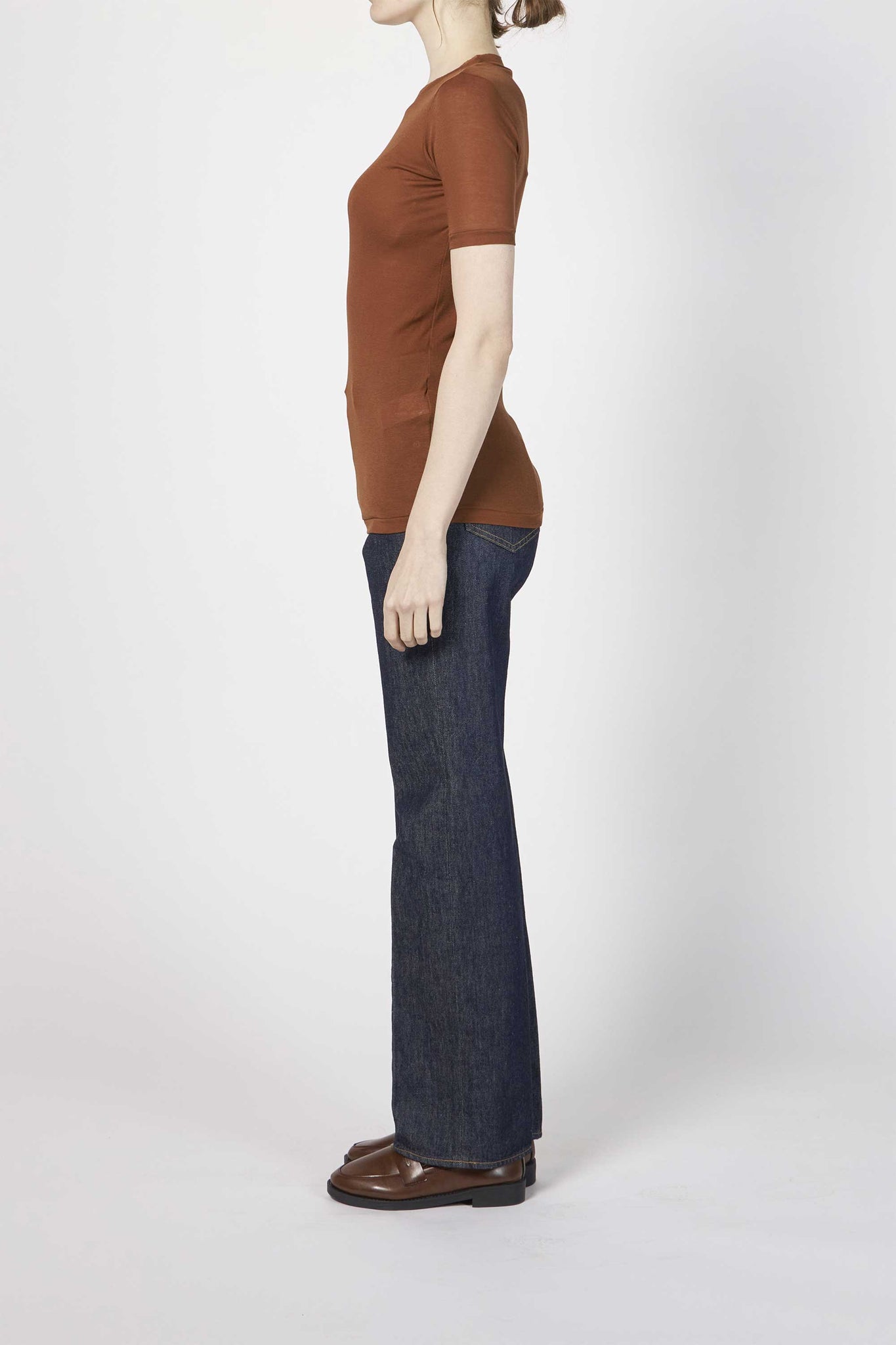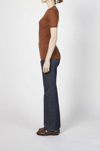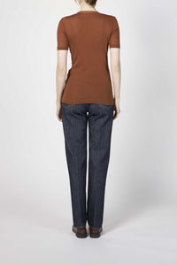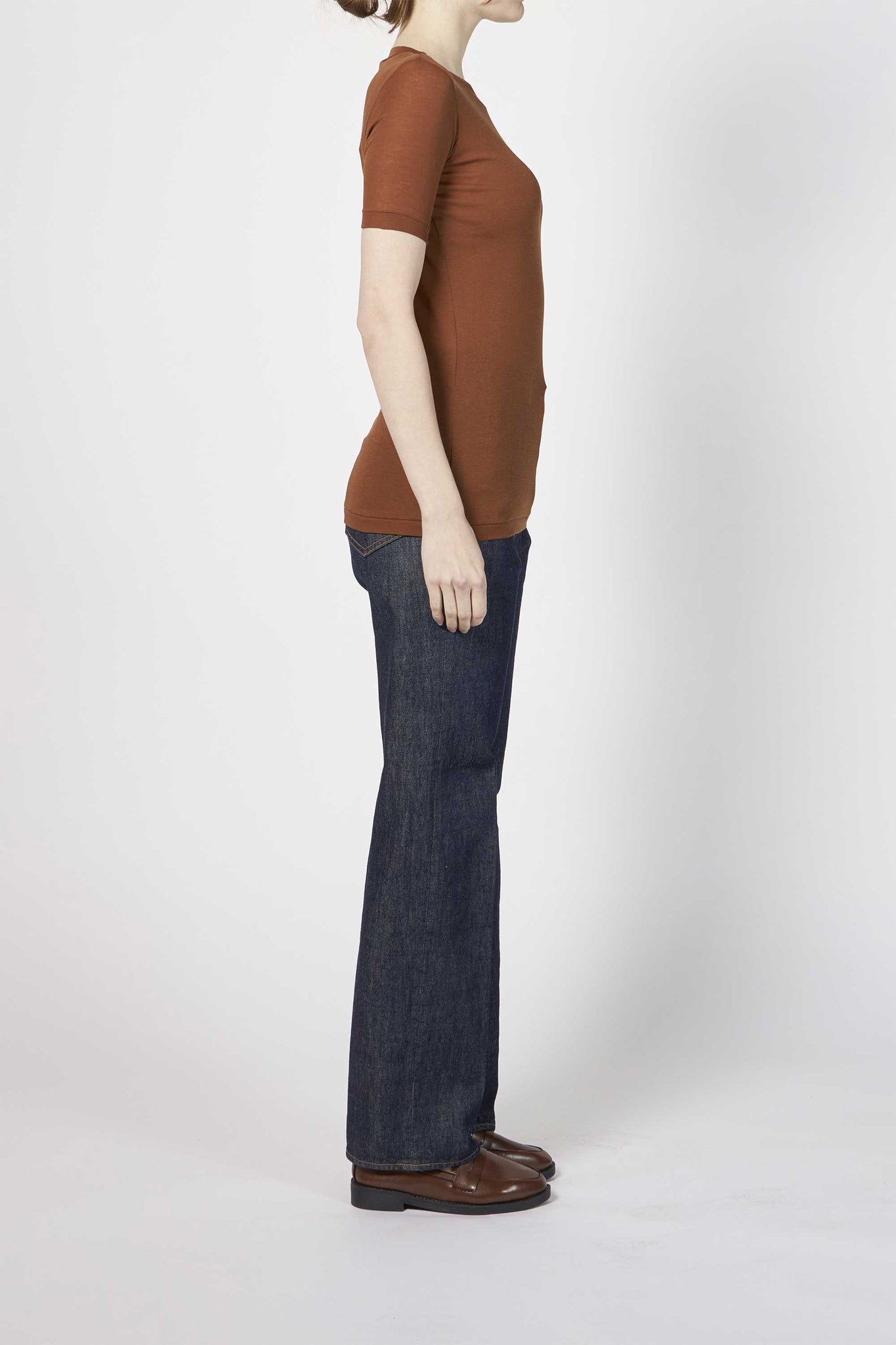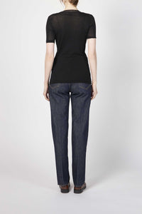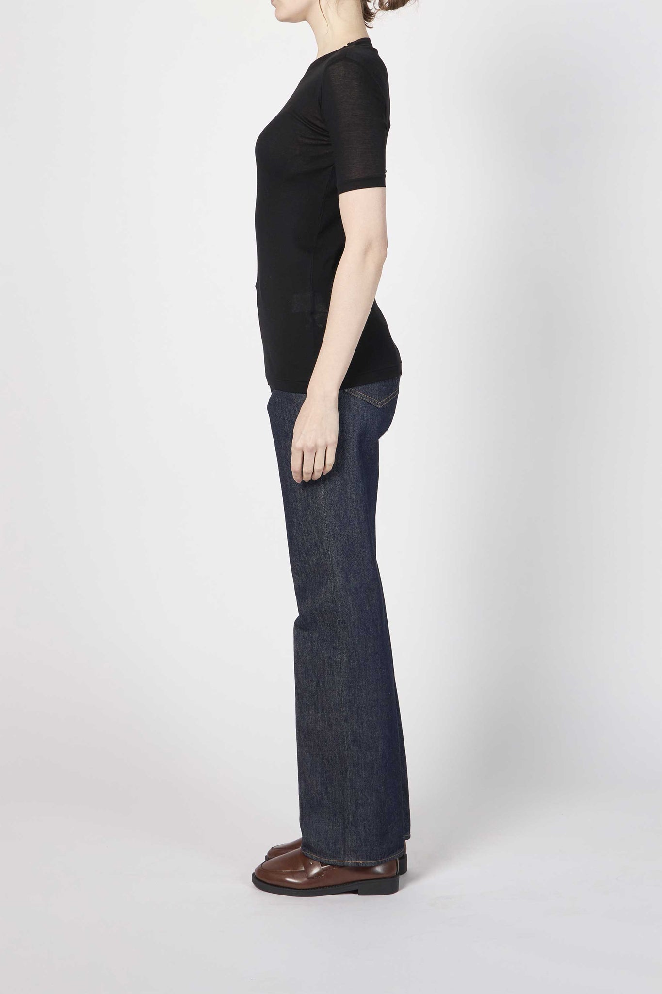 希少な編み機でハイゲージに編み上げたリブ素材は、驚くほど薄く軽やかで、繊細な透け感が特徴です。