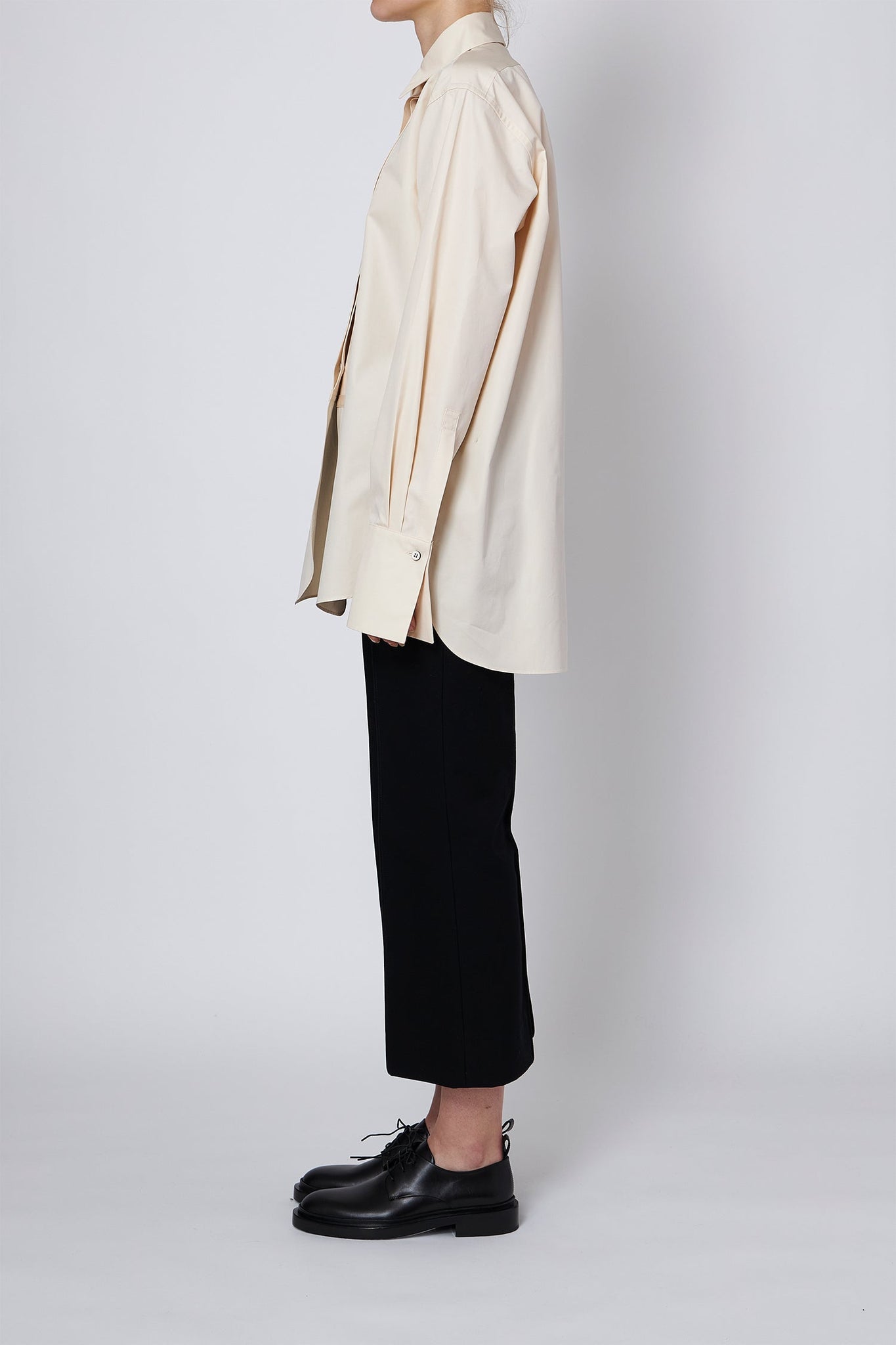 前身頃にはボックスプリーツ、綺麗な曲線美をもつ裾、大きめに仕上げられたリブは特に印象的で、ジル サンダーらしい洗練とモダニティを象徴づけるデザインとなっています。