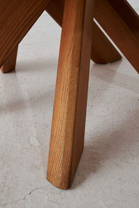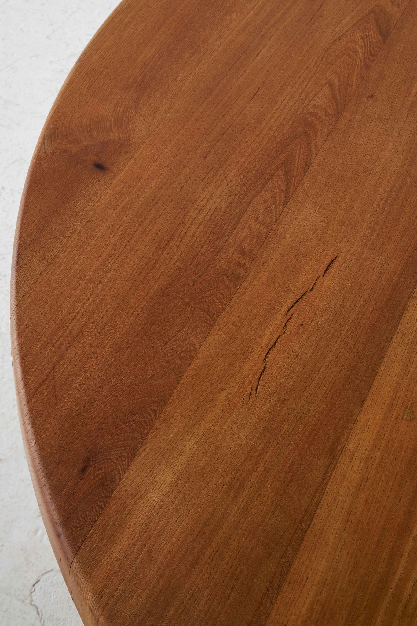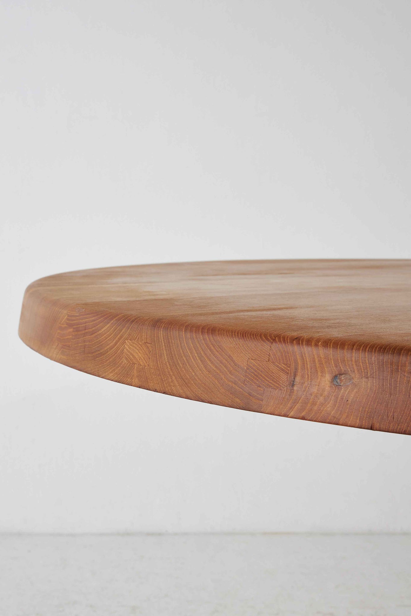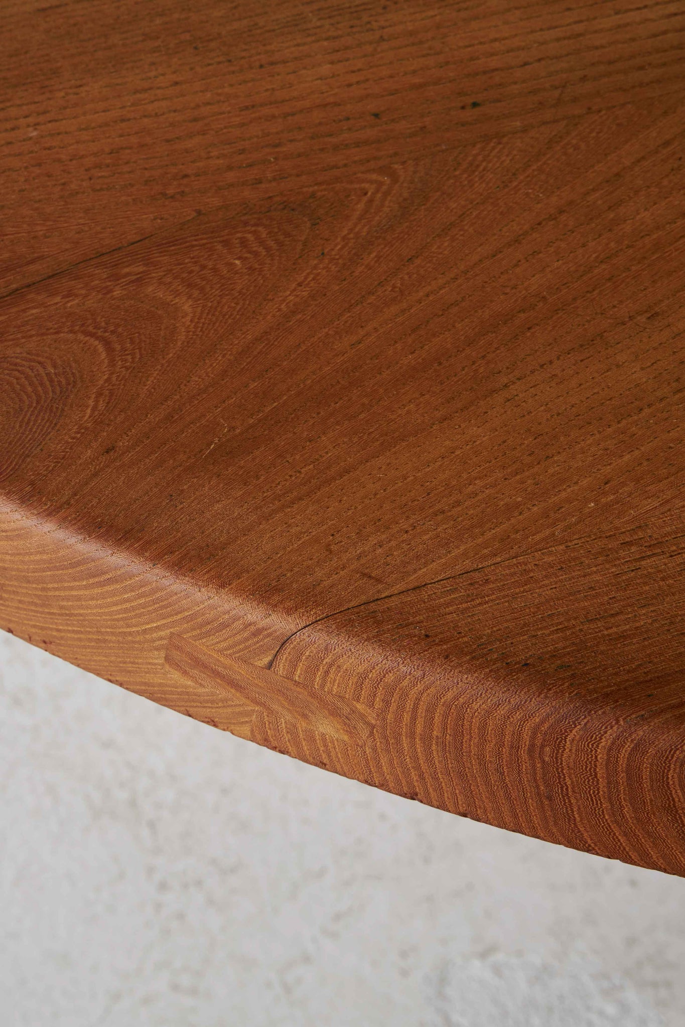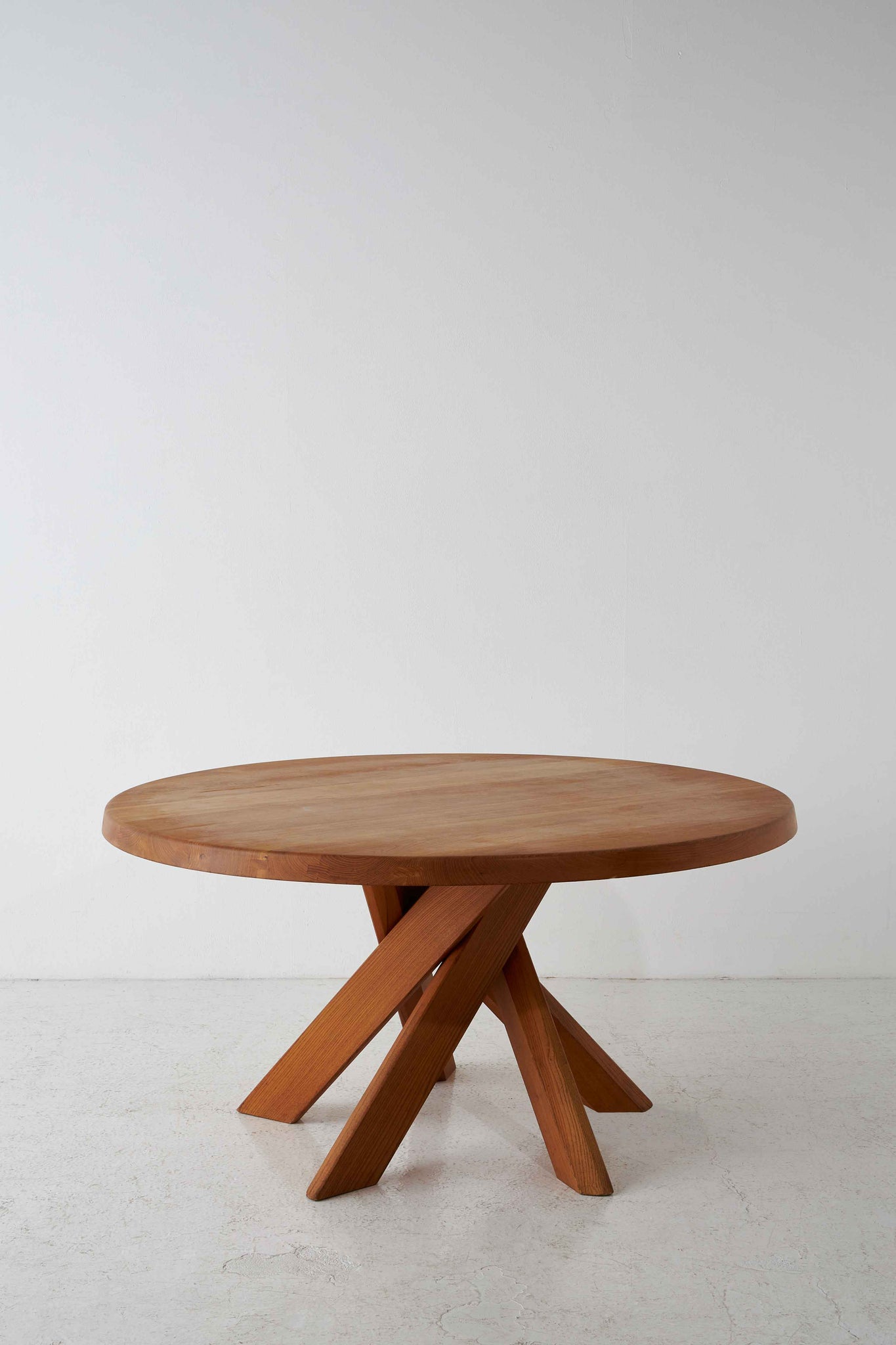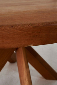Well-crafted 5-legged round table in solid elm. Model T21 is also called Sfax. The authentic designs and impeccable construction show outstanding craftmanship. The five intertwined angled legs create open look and provide a stable construction. The thick top with a slightly angled edge adds an elegance and lightness to the design. The well-proportioned and perfectly made wood-joints visible on the side of the top are true Chapo trademarks. The table beautifully exposed the patina and natural grain of elm.