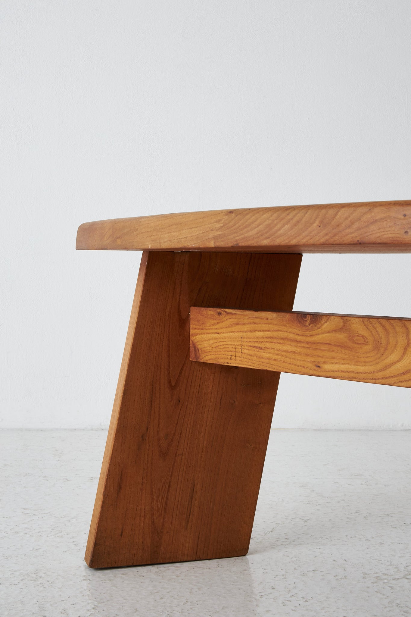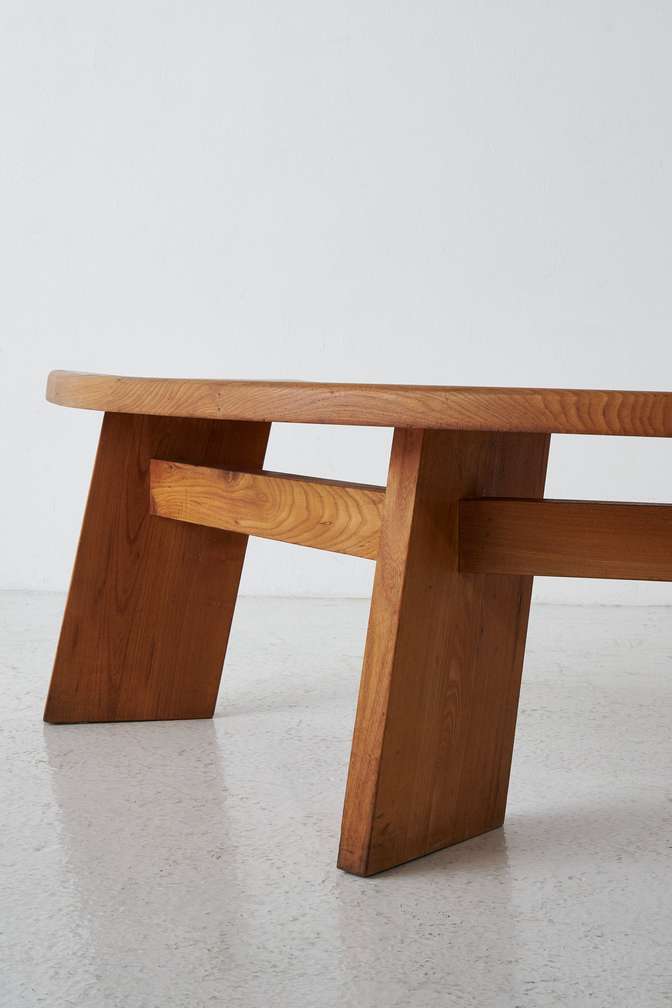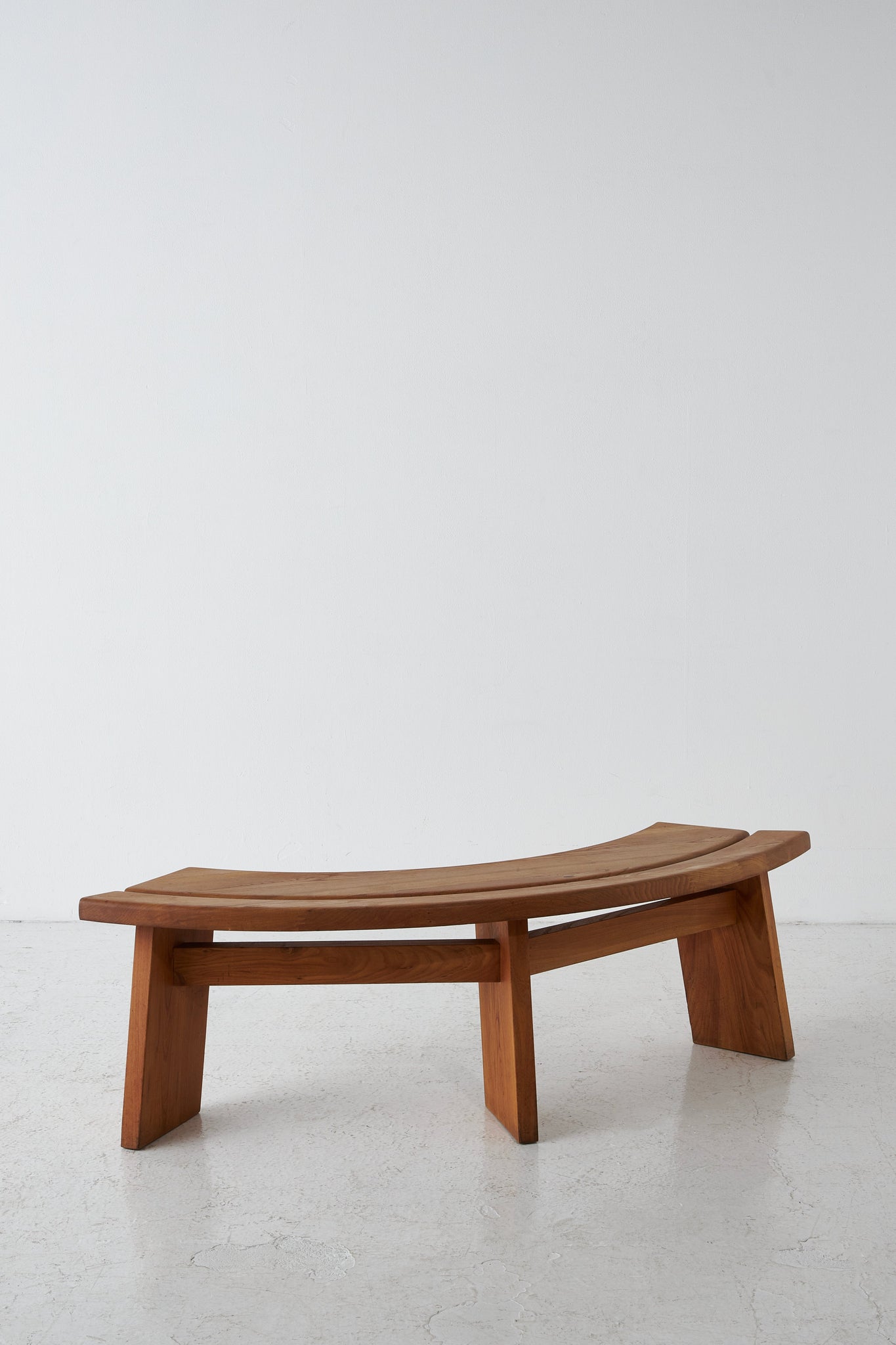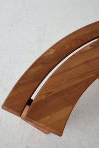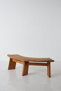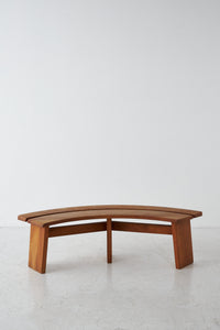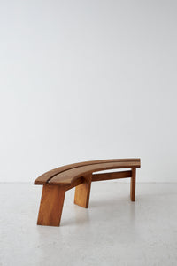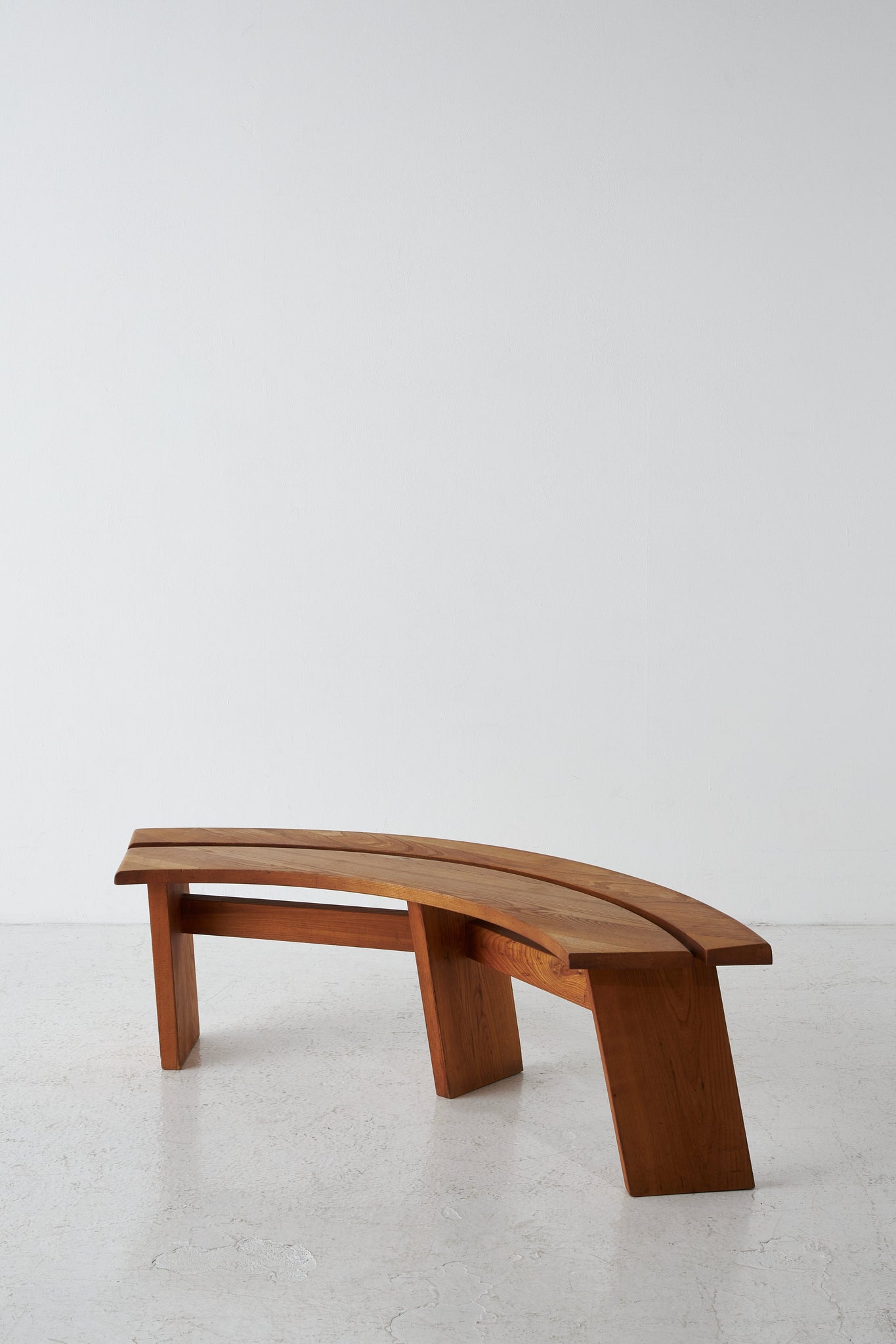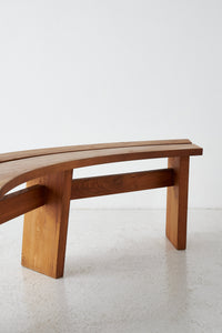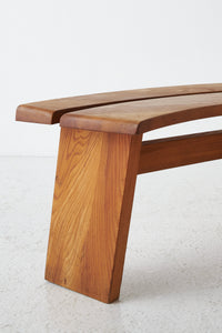 Elegantly curved ¼ round bench in solid elm. The benches are a great fit for a round table. The perfectly made solid wood joints. The warm patina and grain emphasize natural character. The benches are another great example of the creations and craftsmanship of Pierre Chapo.
