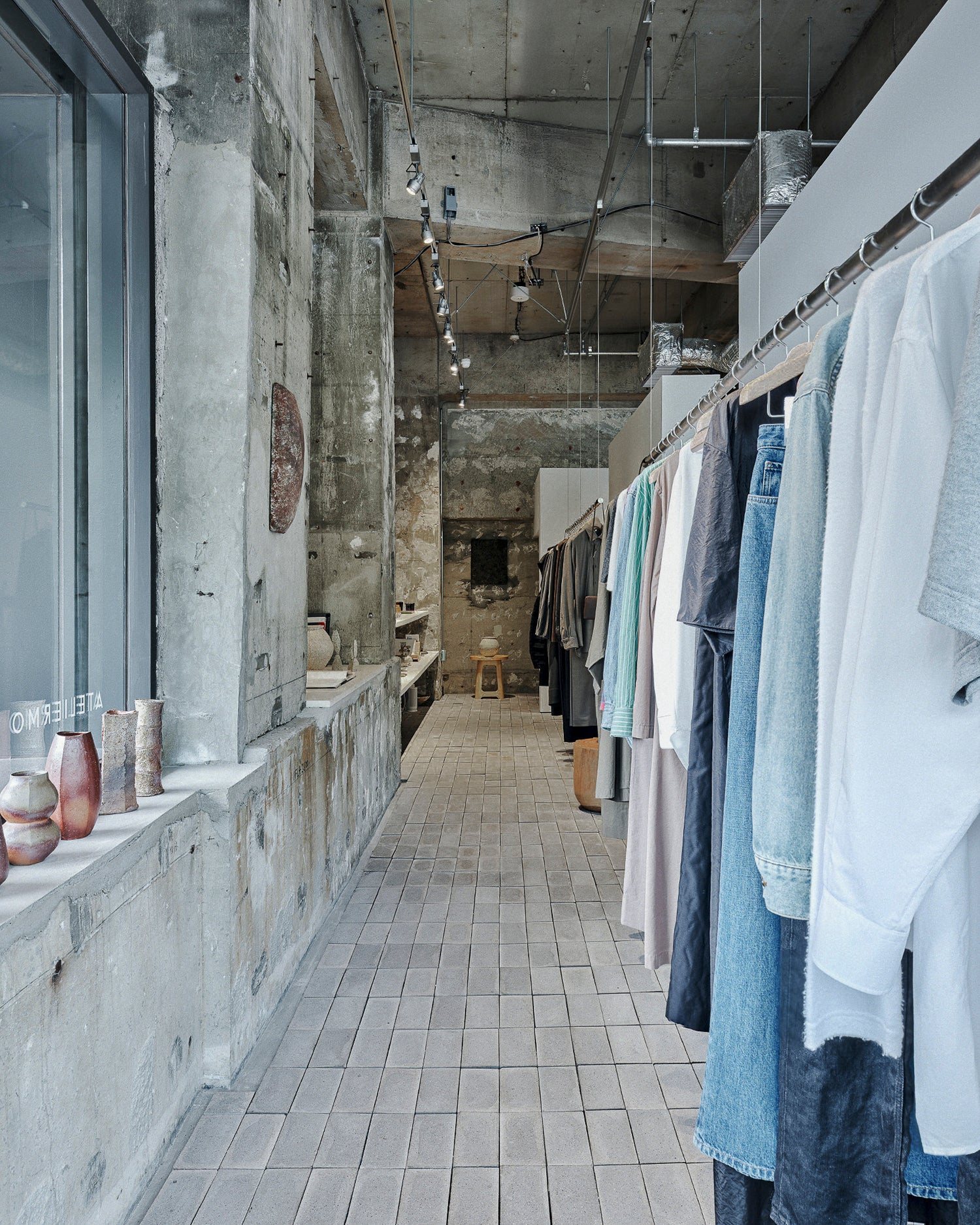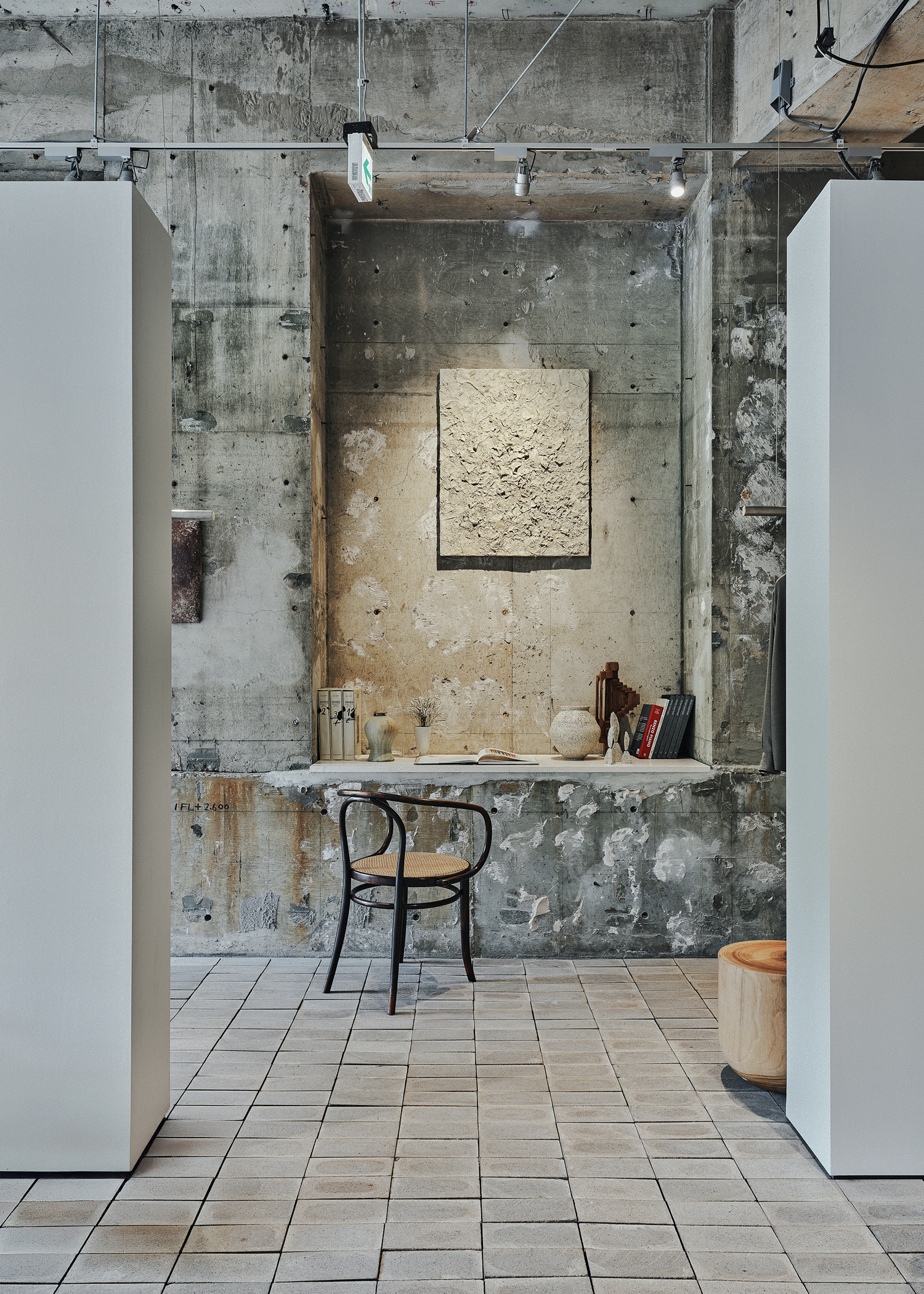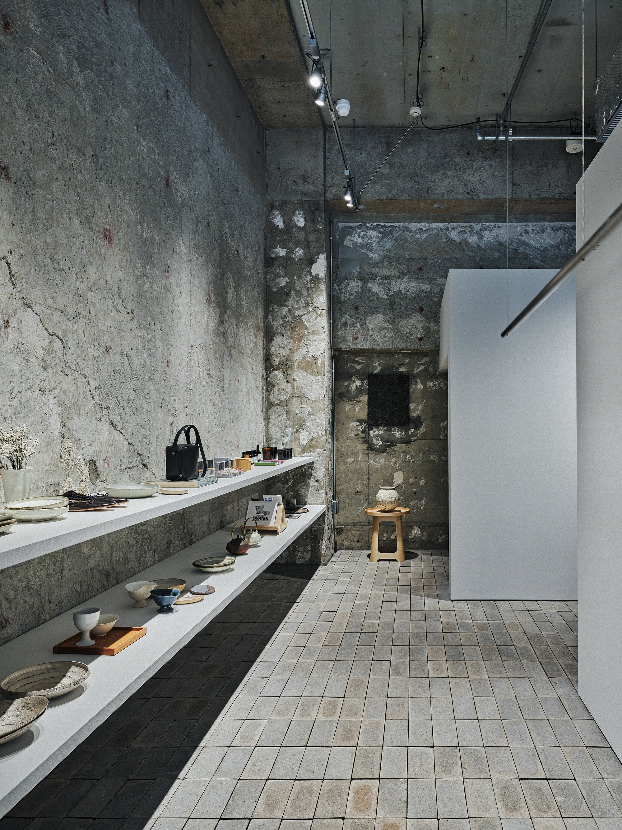 空間は、ビルの躯体をそのまま活かした内壁、白の間仕切り壁、素焼きレンガの床で構成されており、広がりのあるメインエリアと壁に仕切られたエリアが緩やかに繋がることで、奥へと引き込まれるような設計に。
