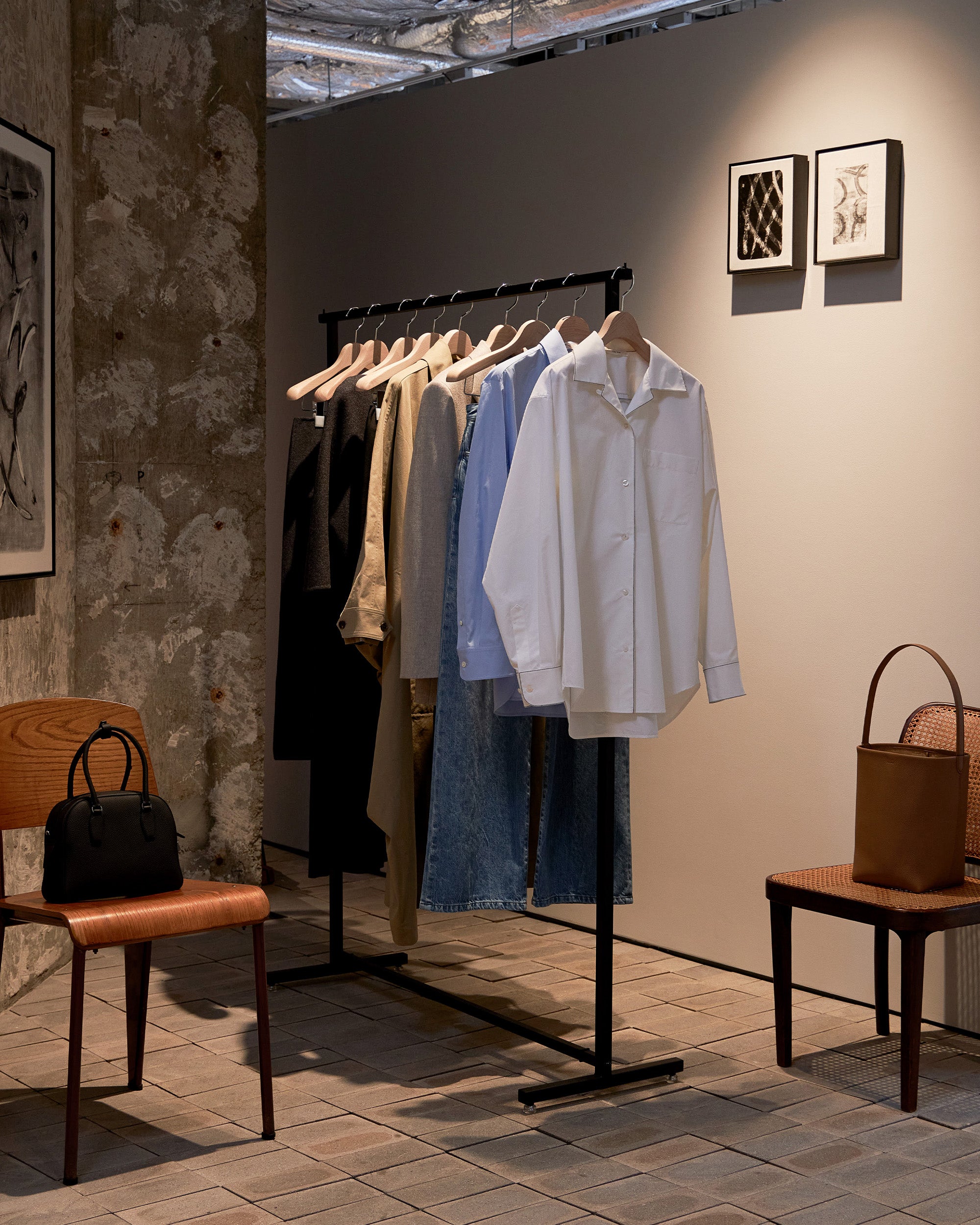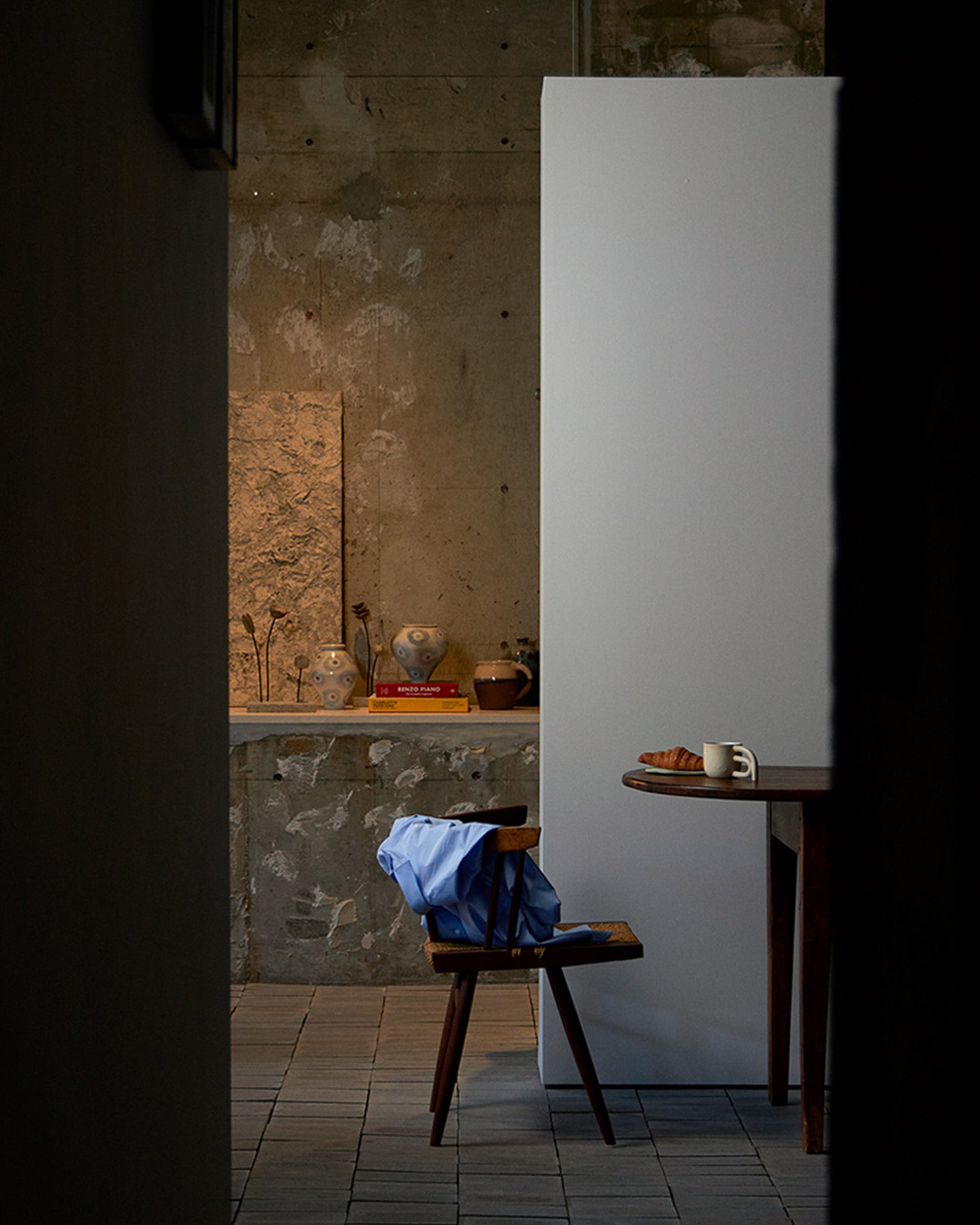 空間は、ビルの躯体をそのまま活かした内壁、白の間仕切り壁、素焼きレンガの床で構成されており、広がりのあるメインエリアと壁に仕切られたエリアが緩やかに繋がることで、奥へと引き込まれるような設計に。