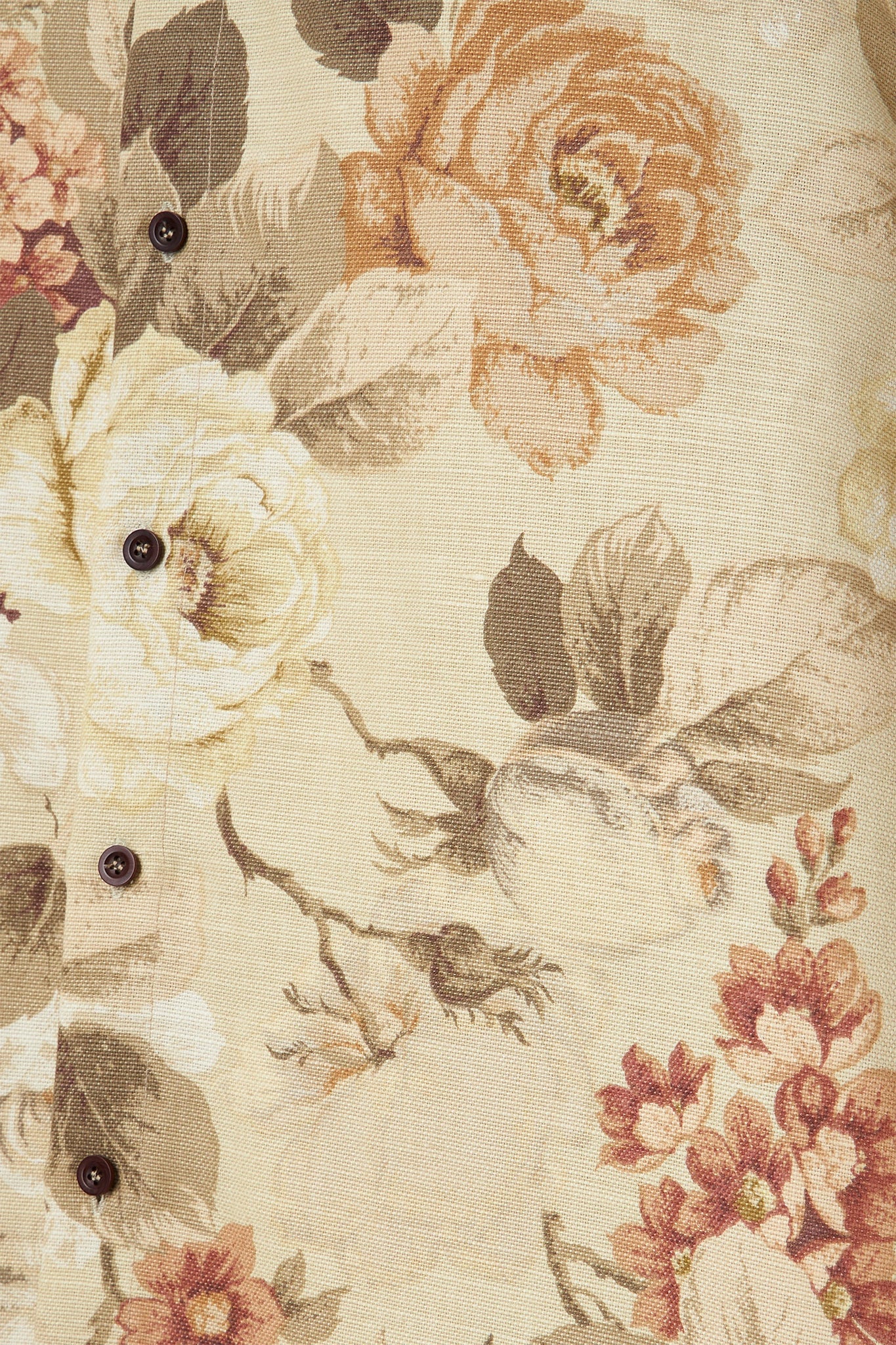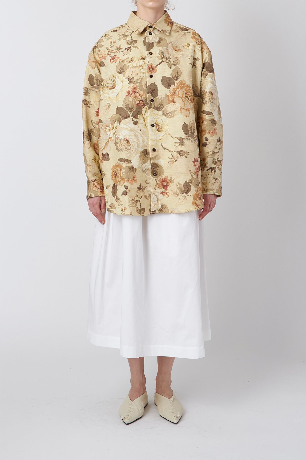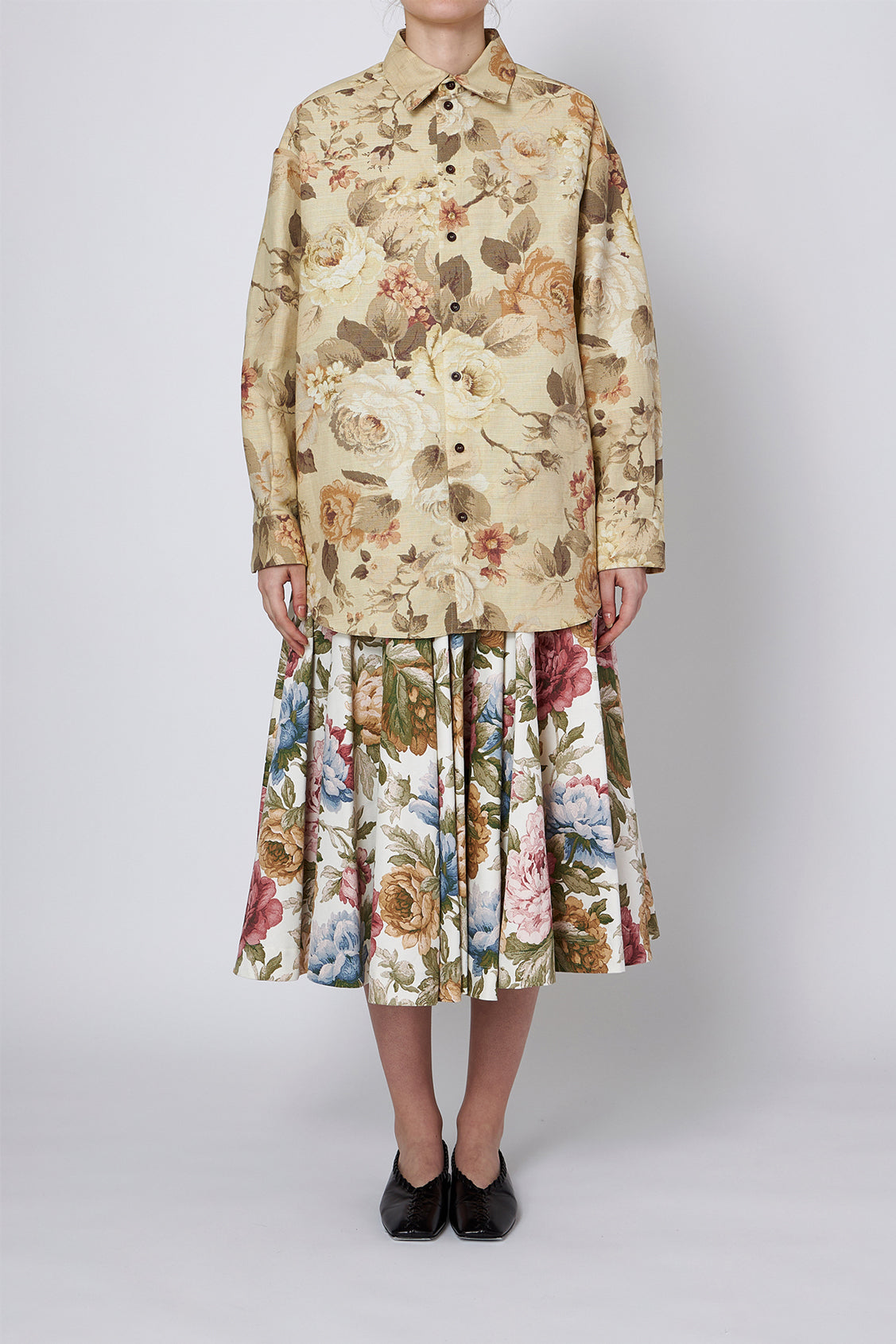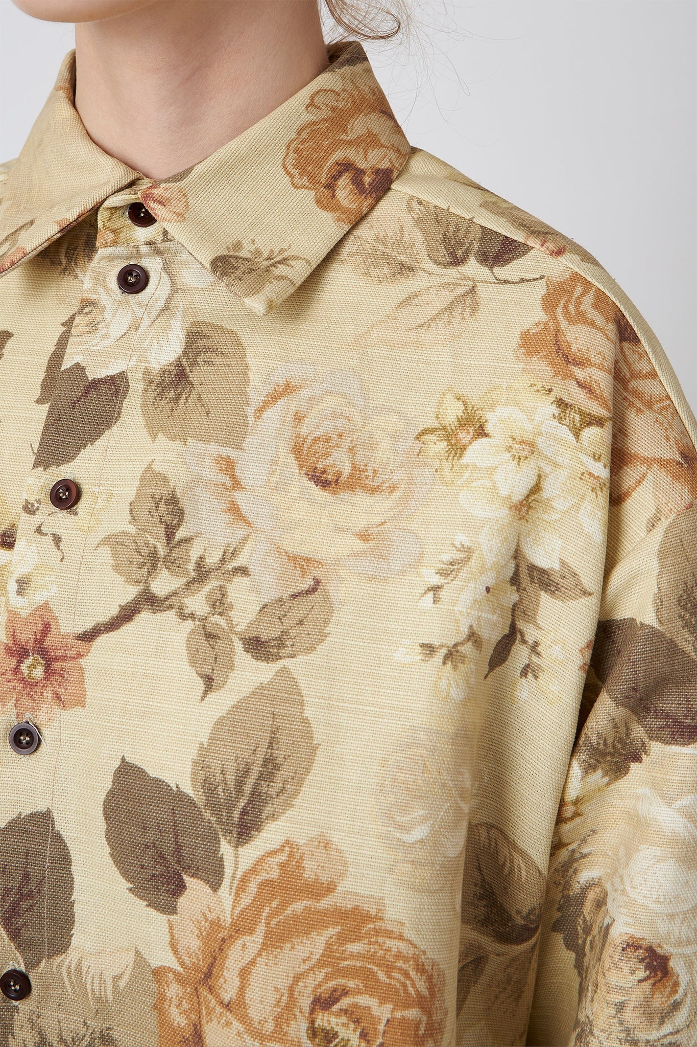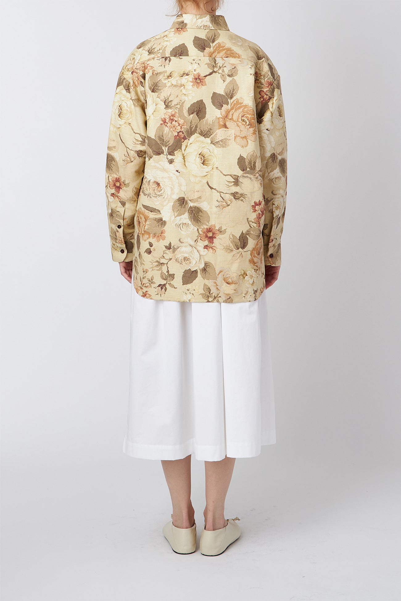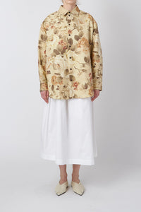 デッドストックの室内装飾ファブリックを使用した、オーバーサイズのフローラルコットンテーラードシャツ。