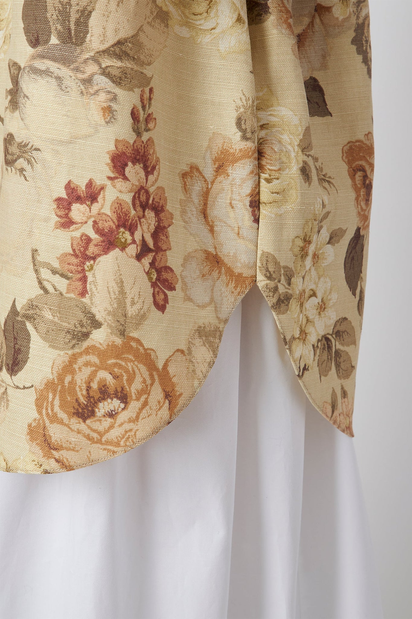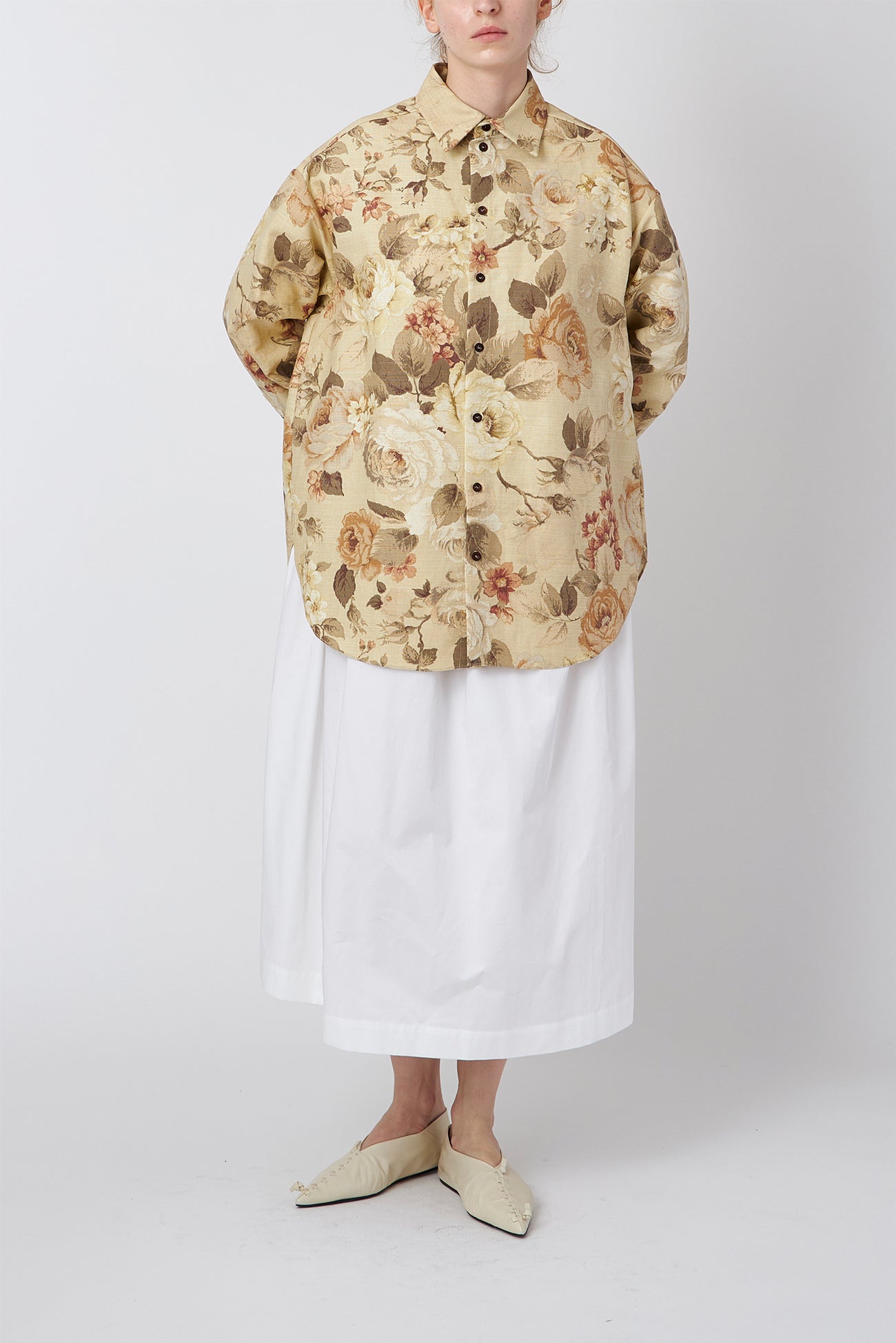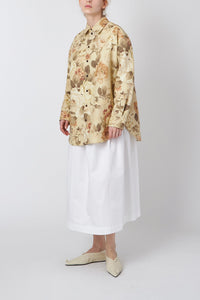 同じフローラルコットンテーラードシャツの「GERTRUDE DRESS」とは違い、落ち着いたティーカラーのプリントが特徴的。手作業で仕立てられたオーバーサイズフィットのテーラードシャツは、室内装飾ファブリックの張りがさらに美しいボリュームを加え、ロングラインのヘムはカーブしてボリュームに軽さを出しています。