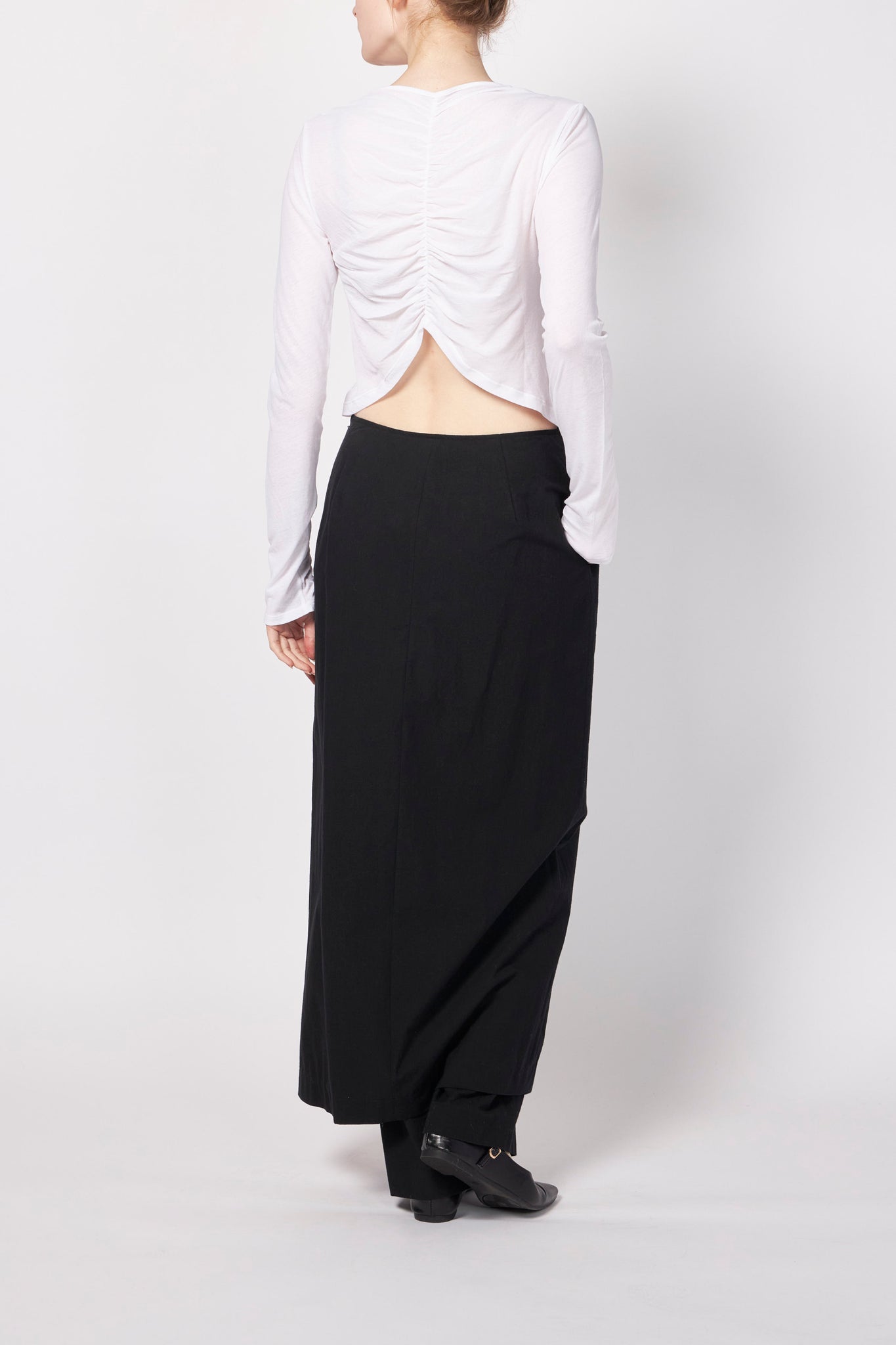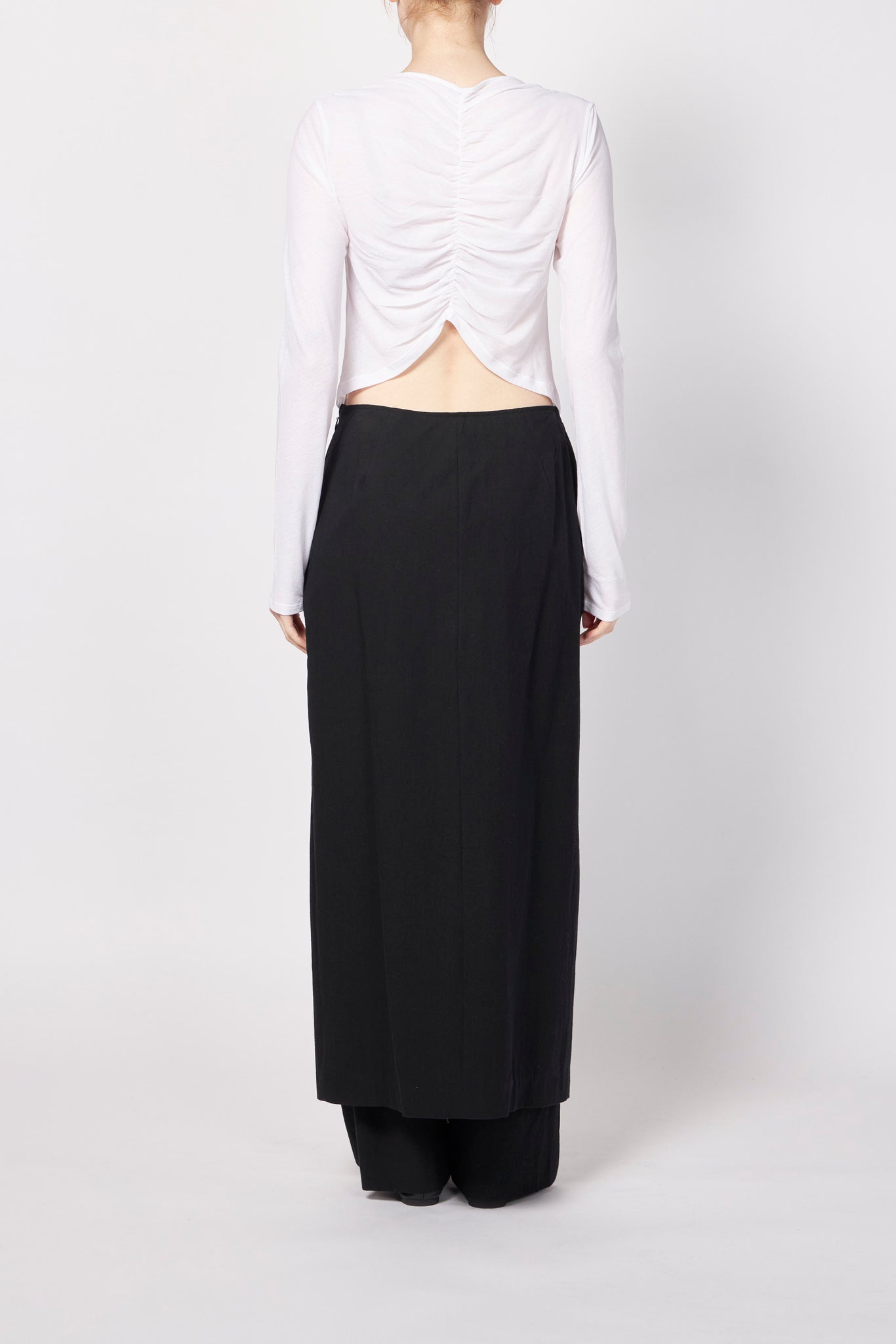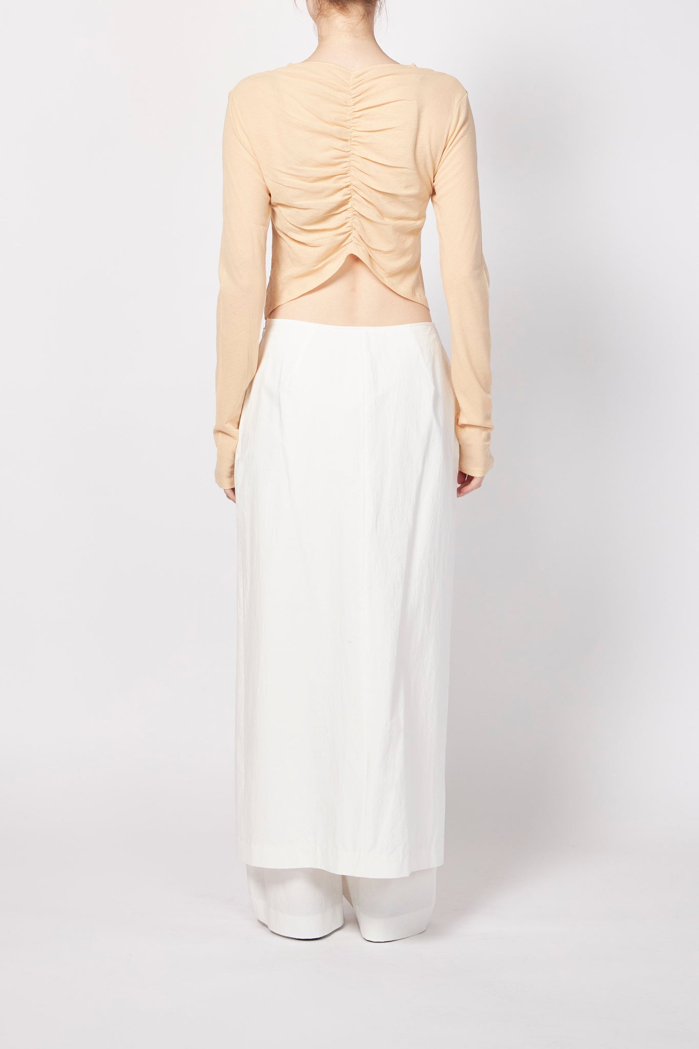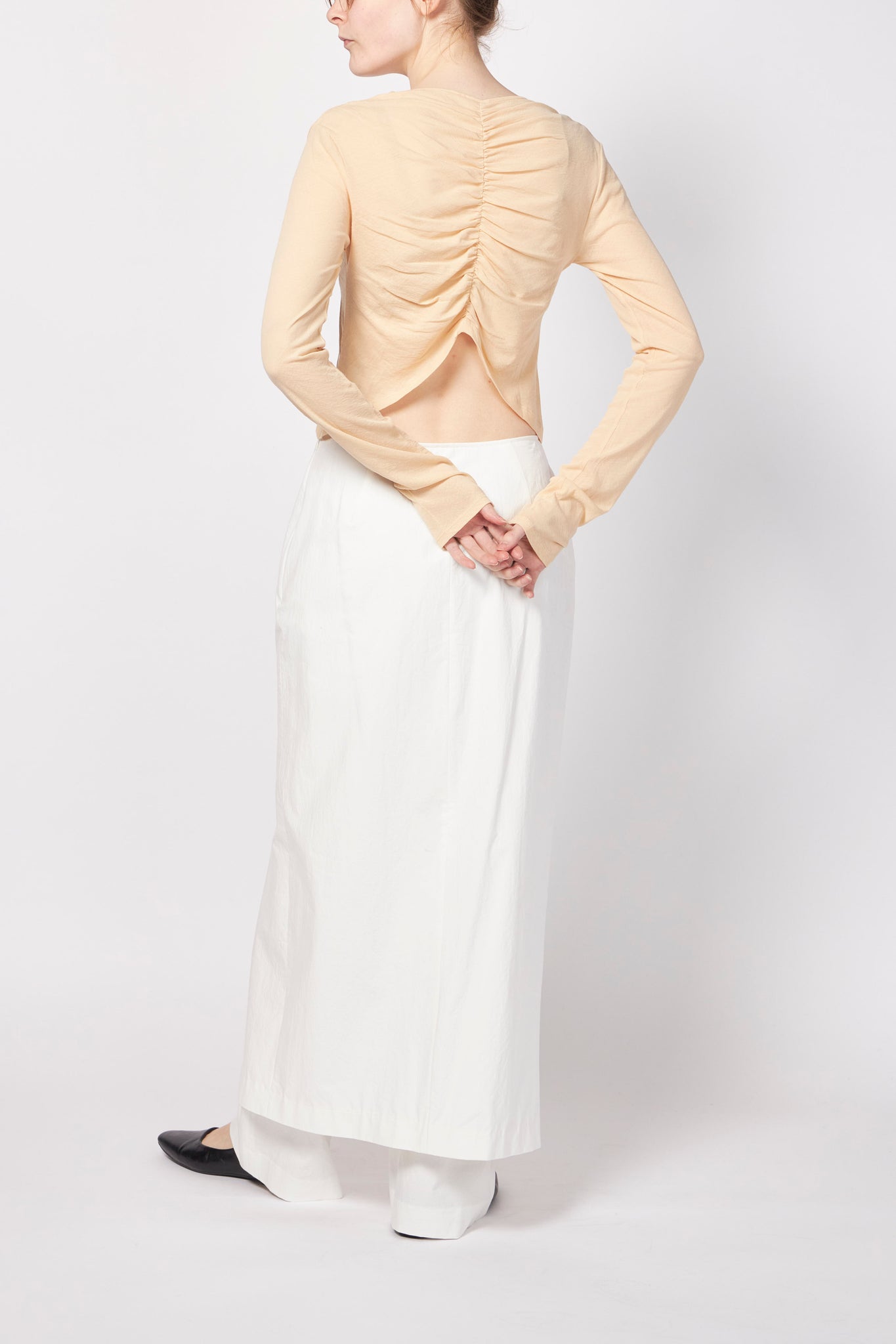 80/1のコンパクト紡績糸を使用し、追撚加工によって程よいシャリ感をプラス。身体の曲線を美しく引き立てるフィットシルエットが特徴で、インナーとしても自在にスタイリング可能です。背面に施したギャザーディテールが、後ろ姿に立体感と動きをだすことで、シンプルながらも洗練されたニュアンスを纏う1枚となっています。