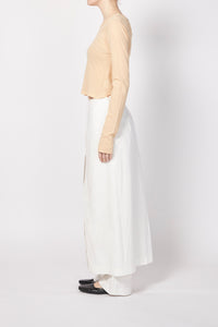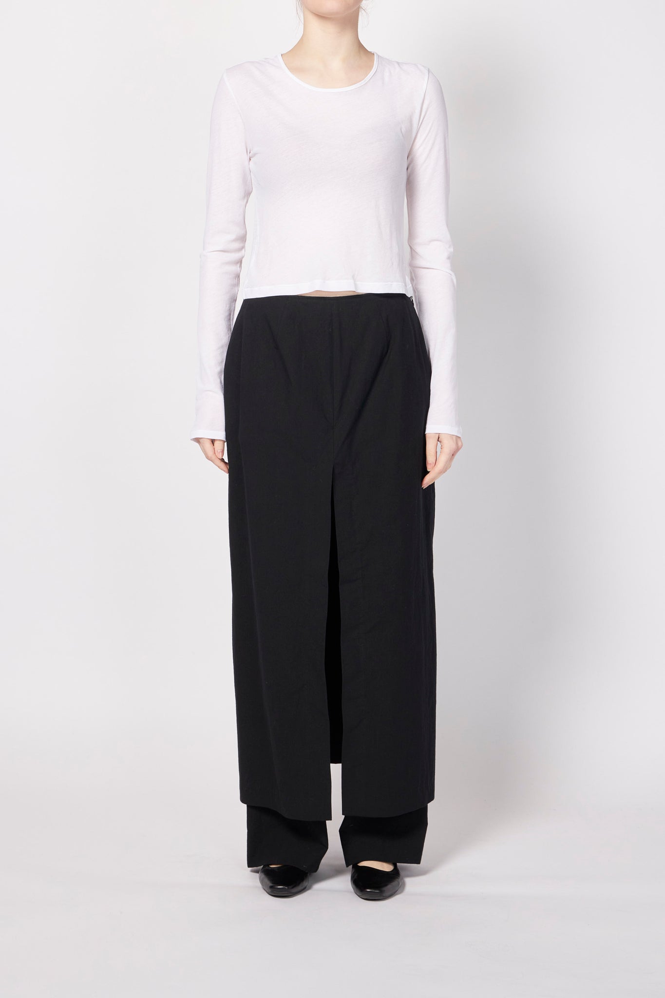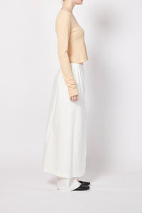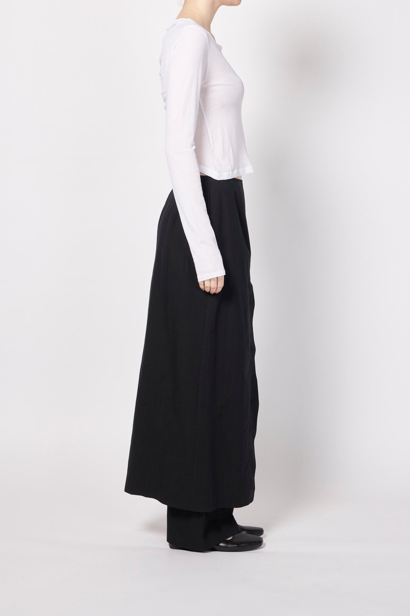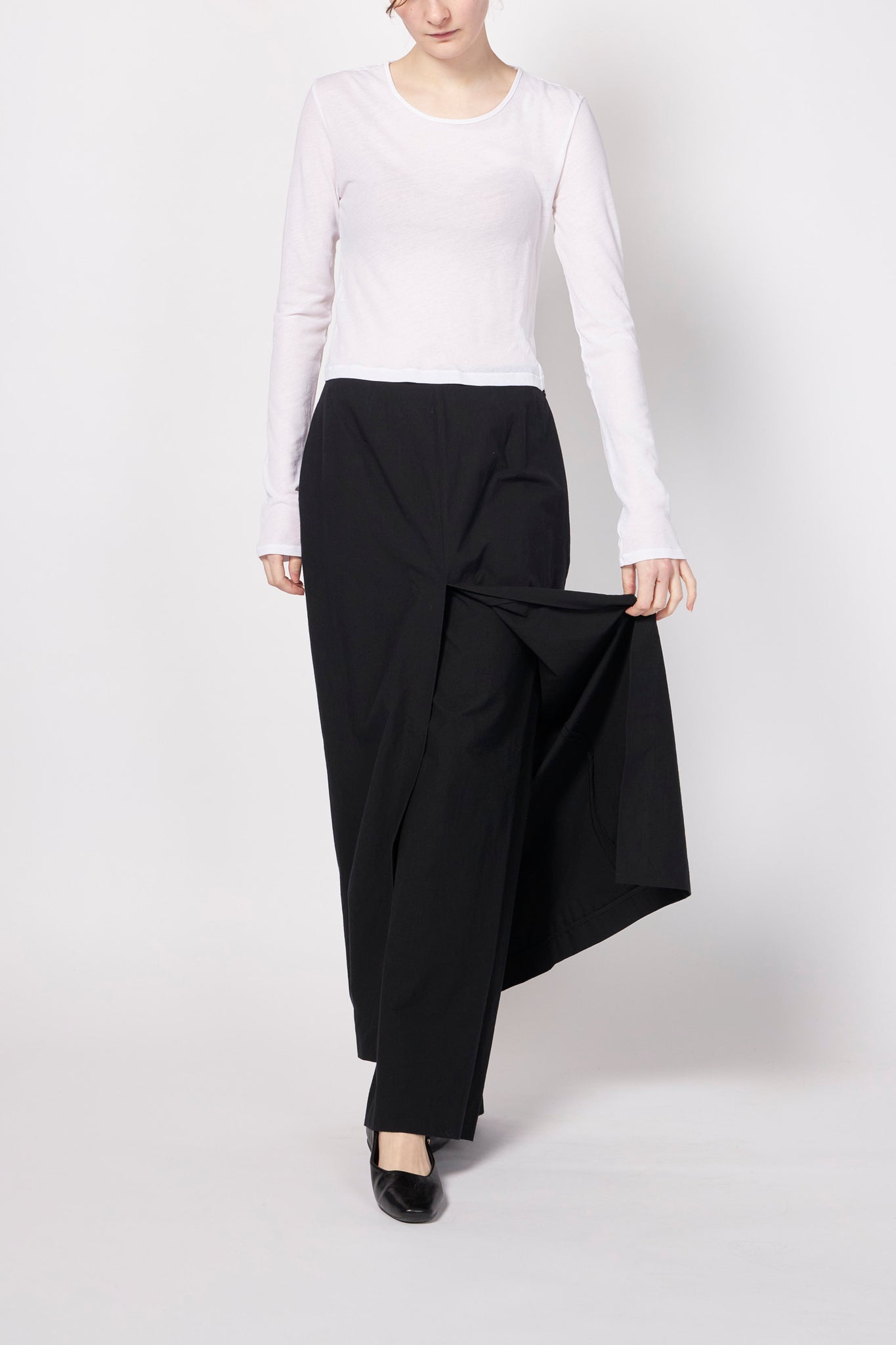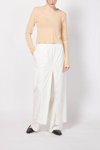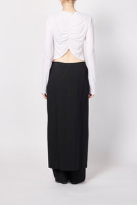 80/1のコンパクト紡績糸を使用し、追撚加工によって程よいシャリ感をプラス。身体の曲線を美しく引き立てるフィットシルエットが特徴で、インナーとしても自在にスタイリング可能です。背面に施したギャザーディテールが、後ろ姿に立体感と動きをだすことで、シンプルながらも洗練されたニュアンスを纏う1枚となっています。