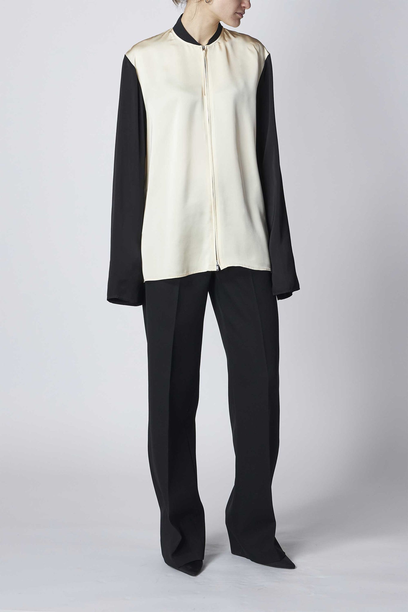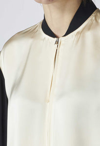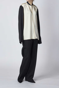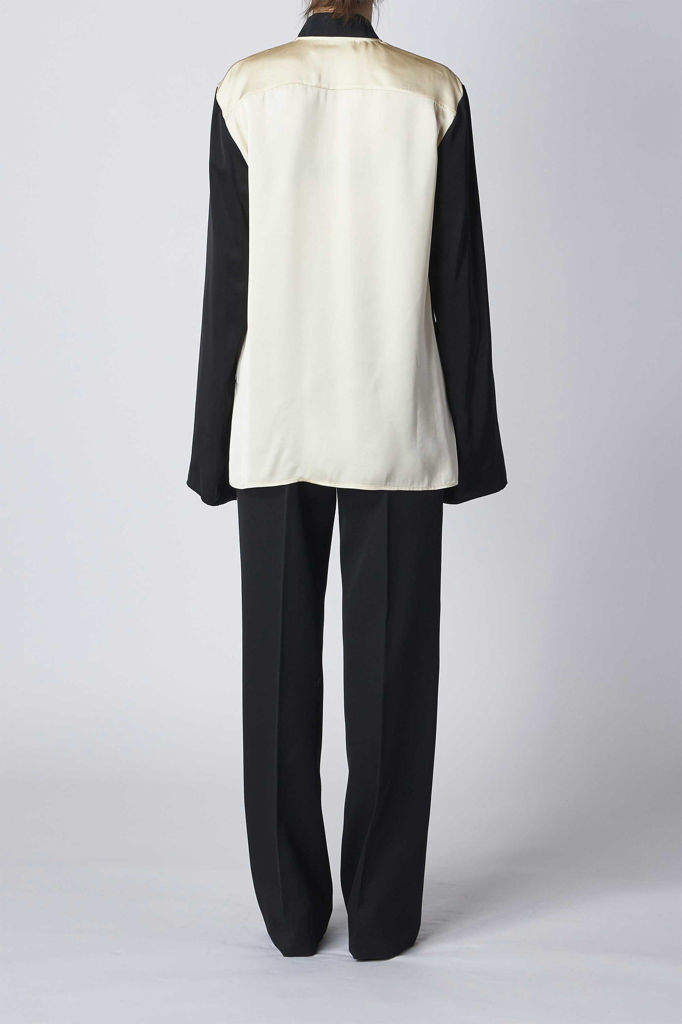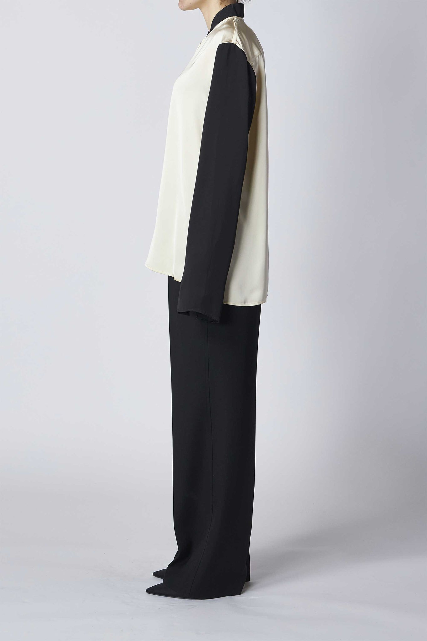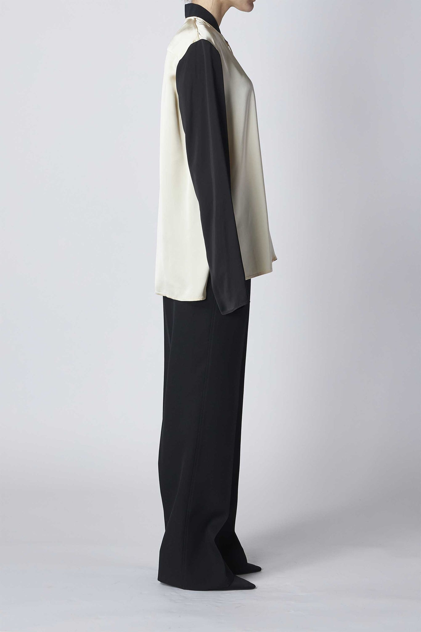 光沢感のあるサテン仕上げで肌馴染みの良さと軽やかさが感じられるパネルシャツ