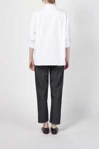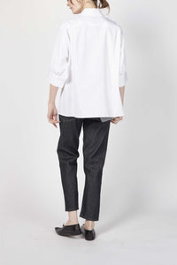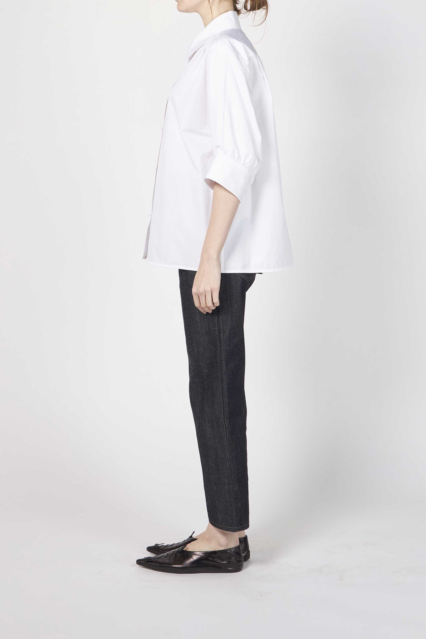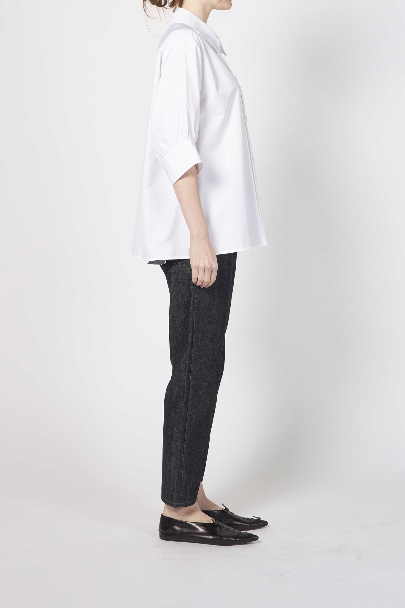 ドロップショルダーやギャザー入りのラウンドボリュームハーフスリーブが、リラックス感と動きのあるシルエットを演出します。