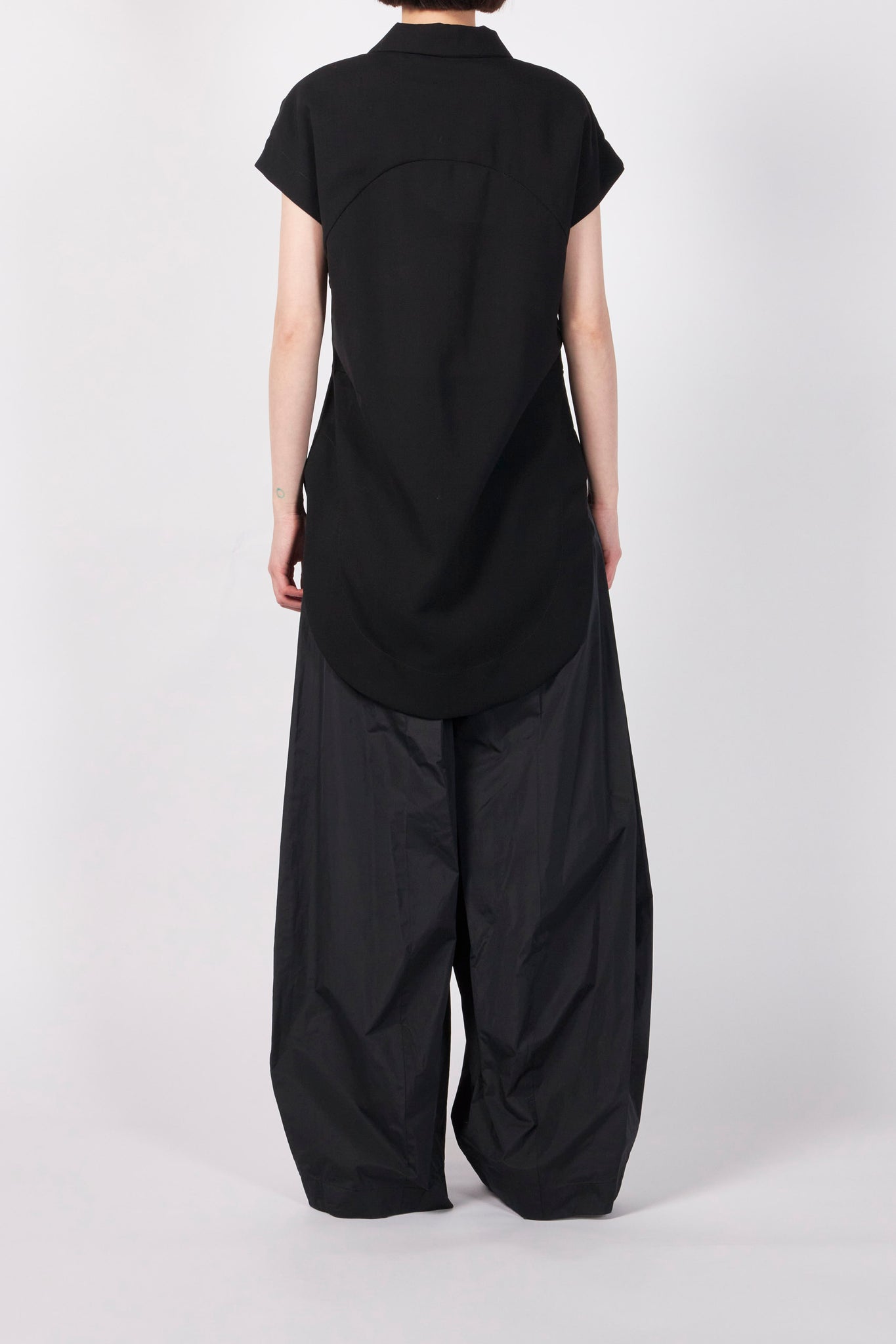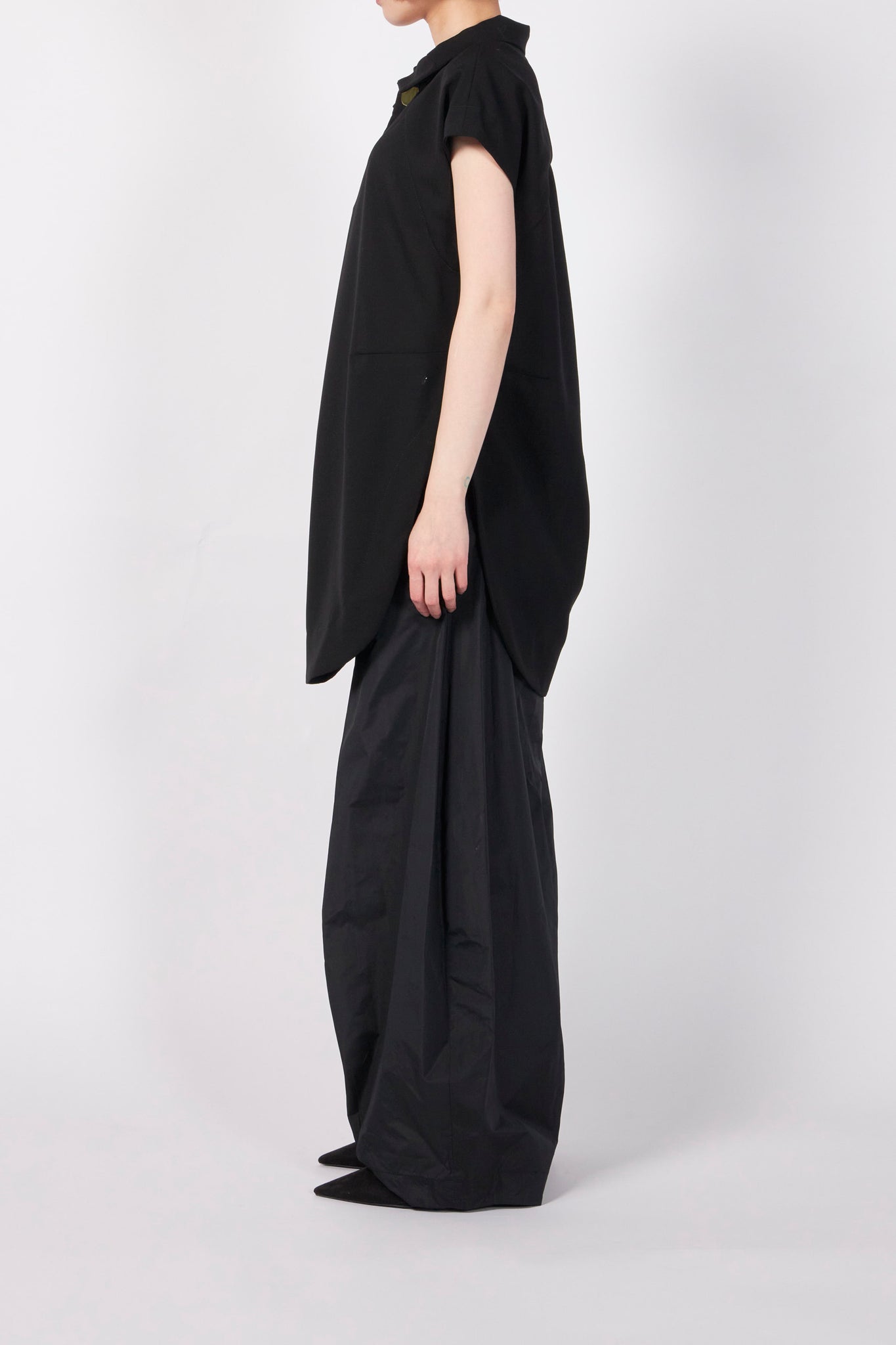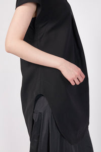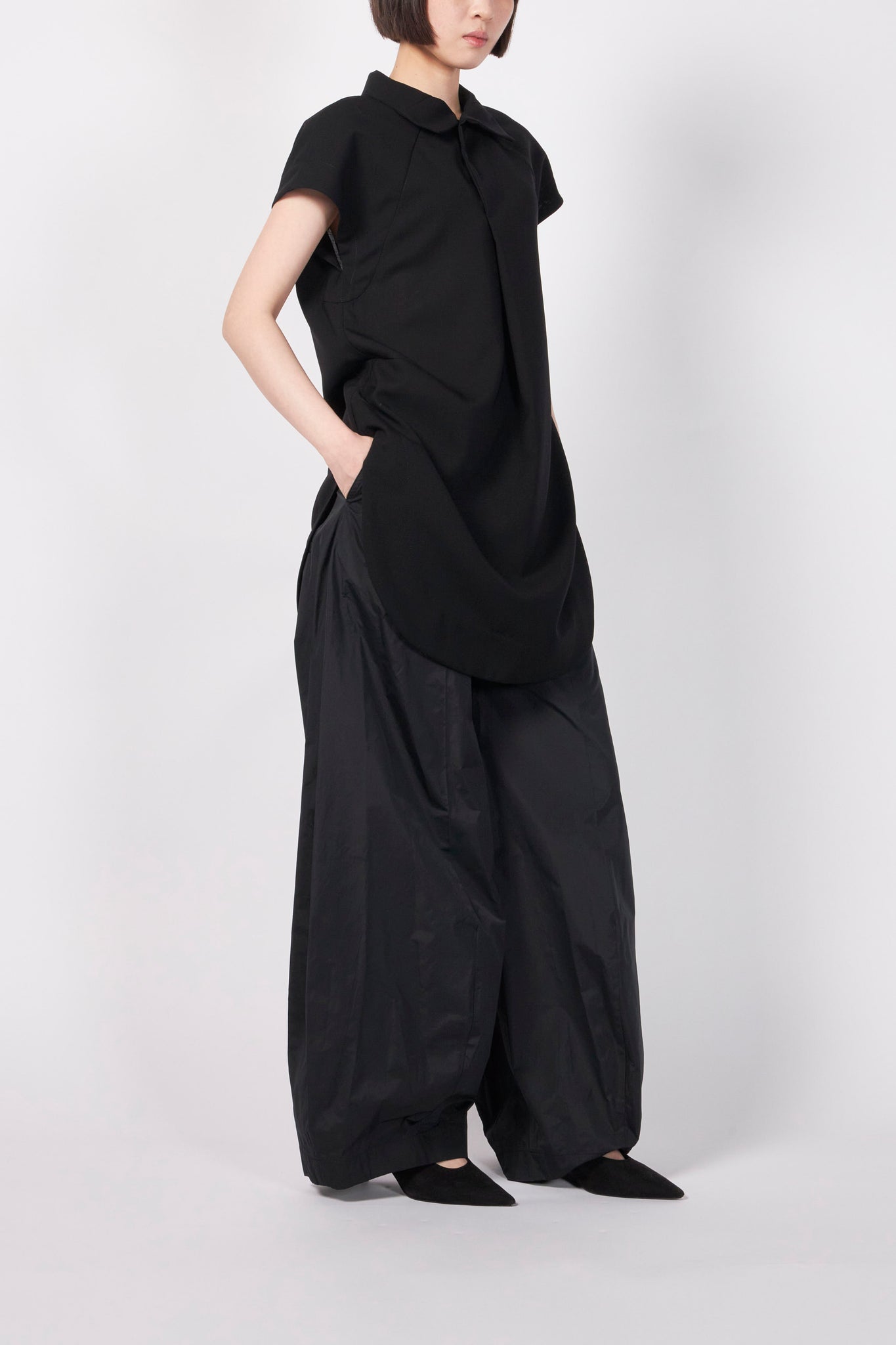 シャープなラインを描くフレンチスリーブが構築的なシルエットを生み、1枚でスタイリングを引き締める存在感を放ちます。