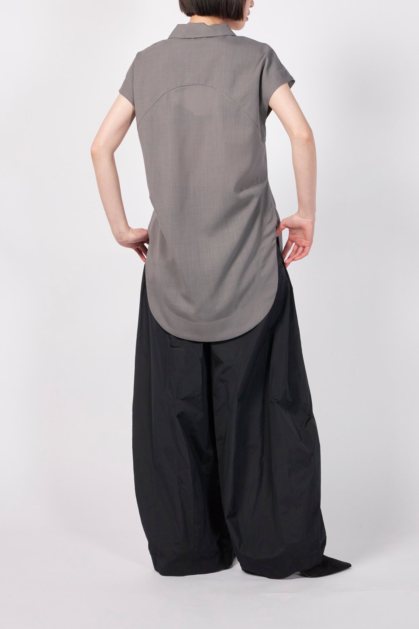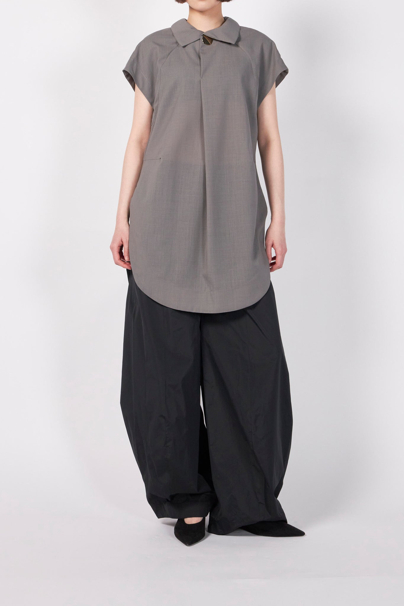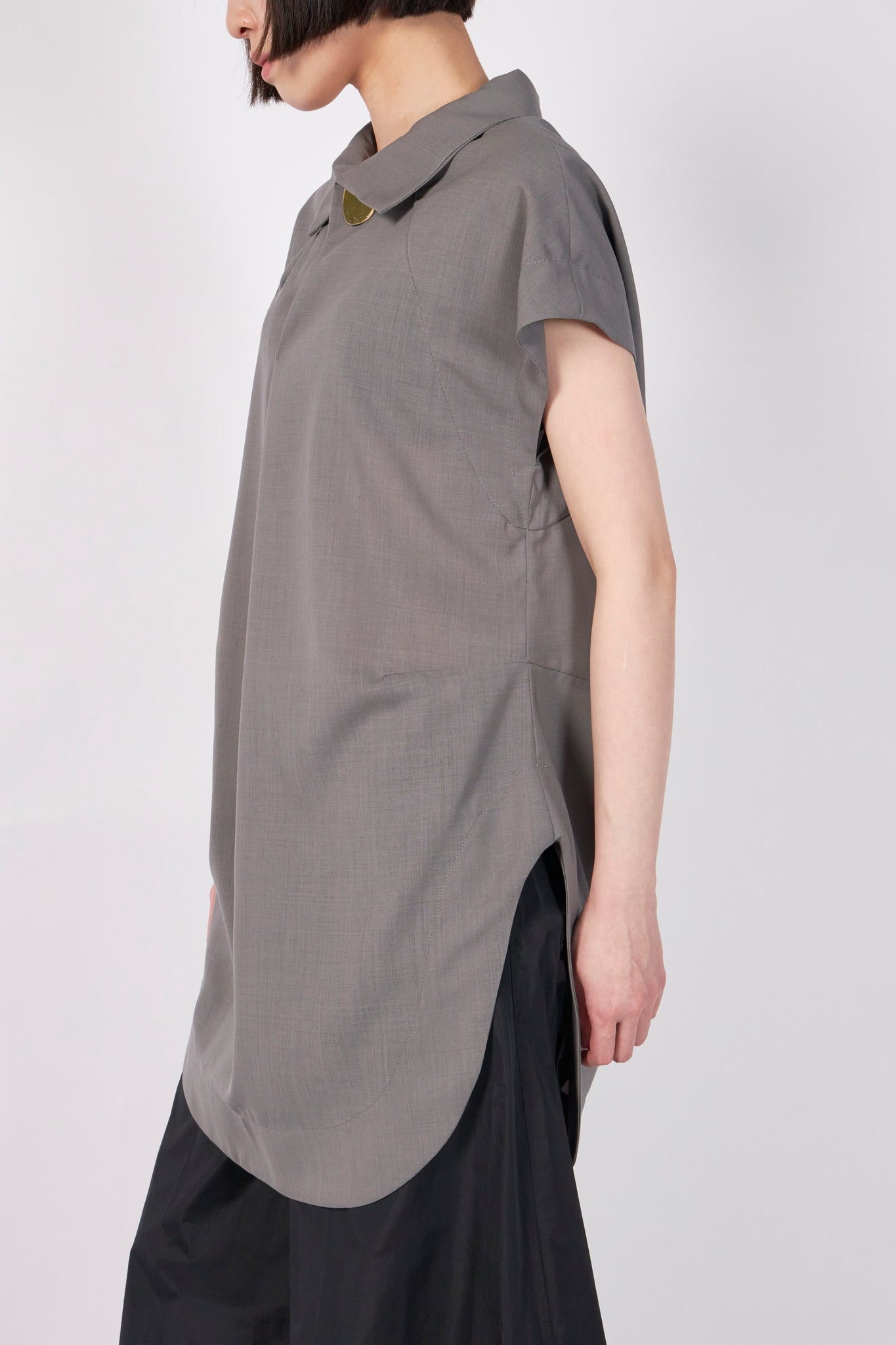 クリーンな表情のサマーウールを使用した、洗練された佇まいのプルオーバーブラウス。