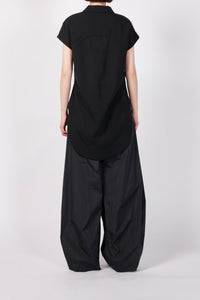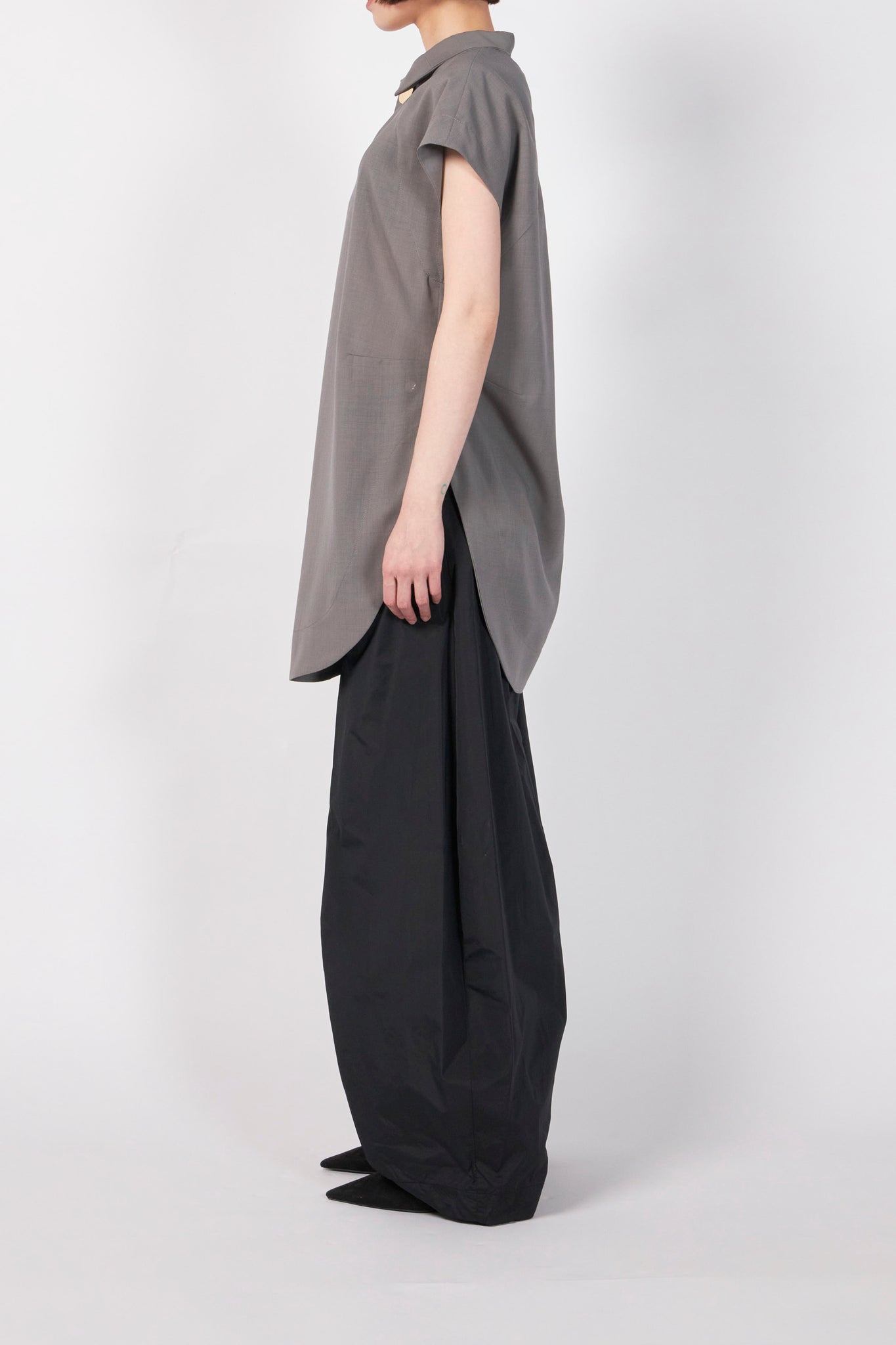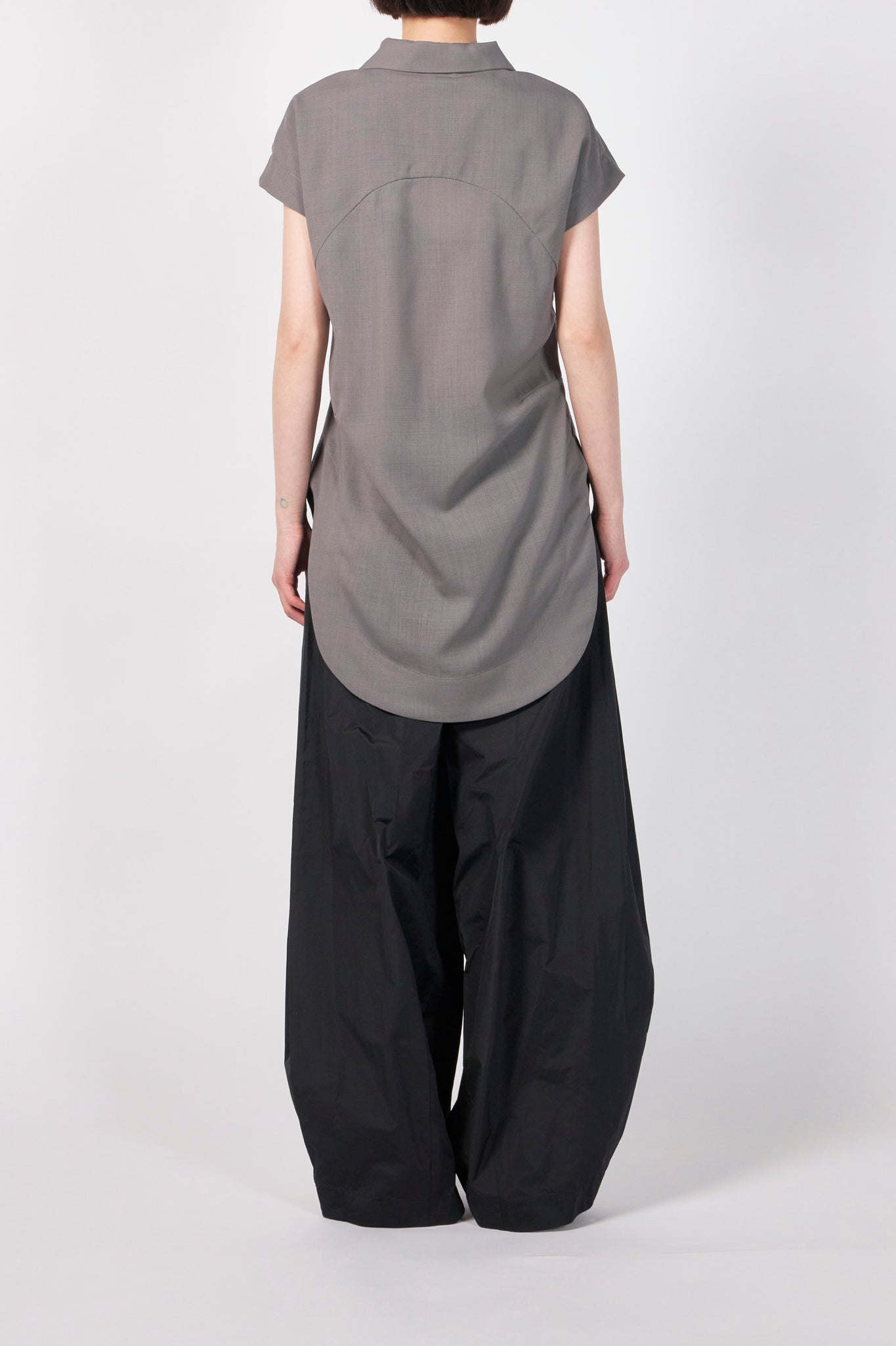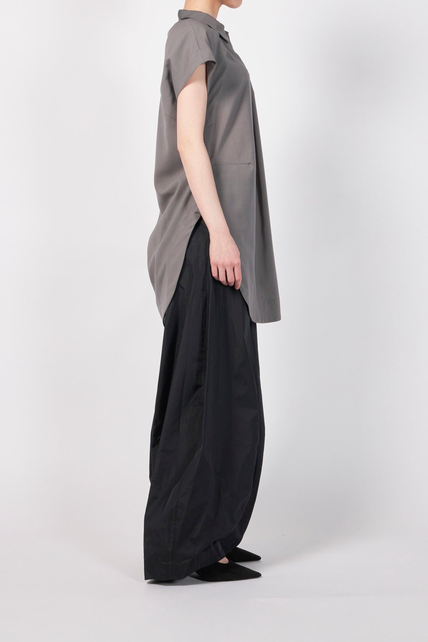 クリーンな表情のサマーウールを使用した、洗練された佇まいのプルオーバーブラウス。