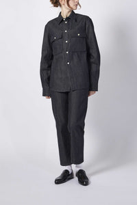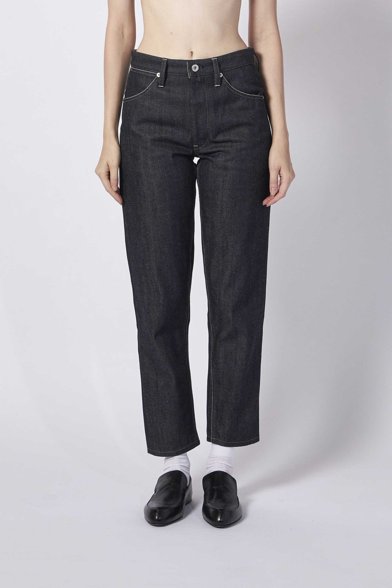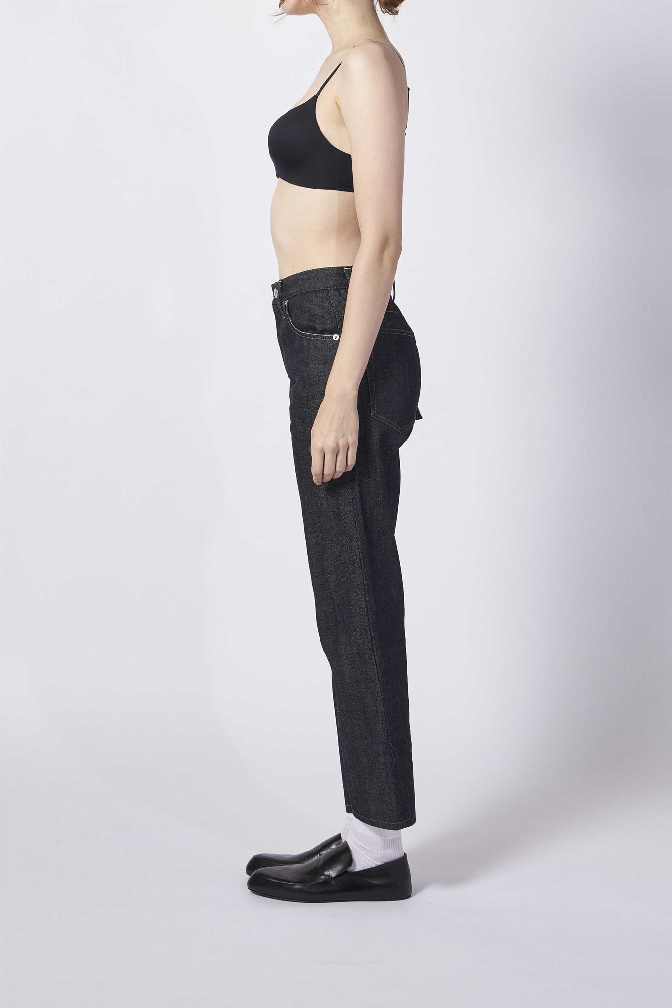 深めの股上とリラックスフィットなシルエットが特徴的。張り感のある日本製のデニム生地は、カジュアルながら上品さも兼ね備えています。