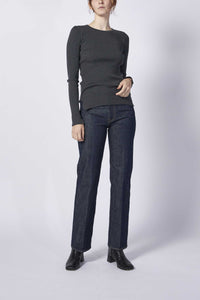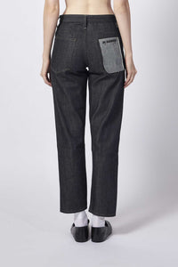 ツイストレッグシームの日本製リジッドデニムパンツ。