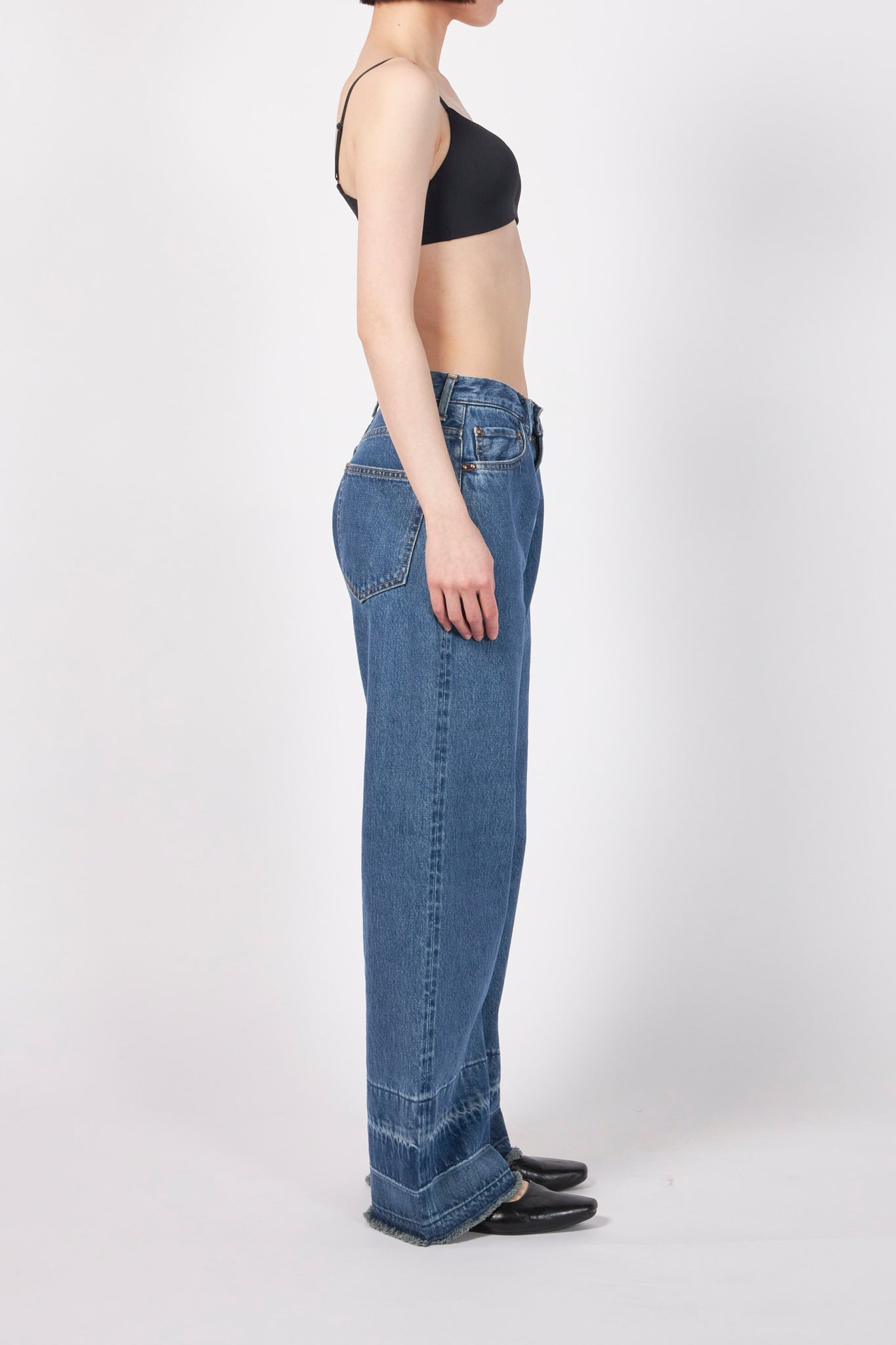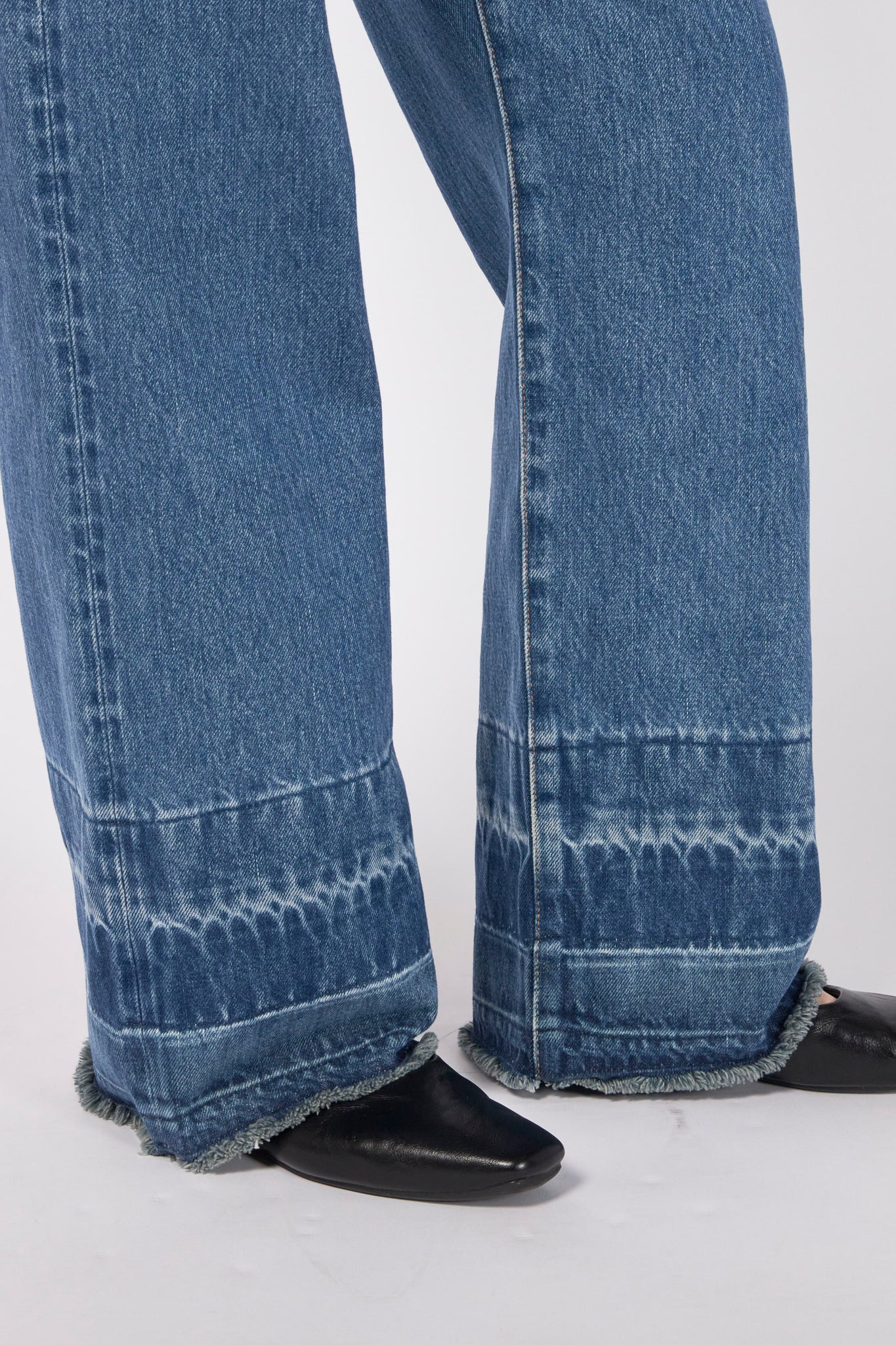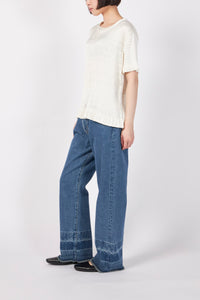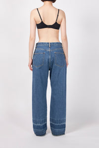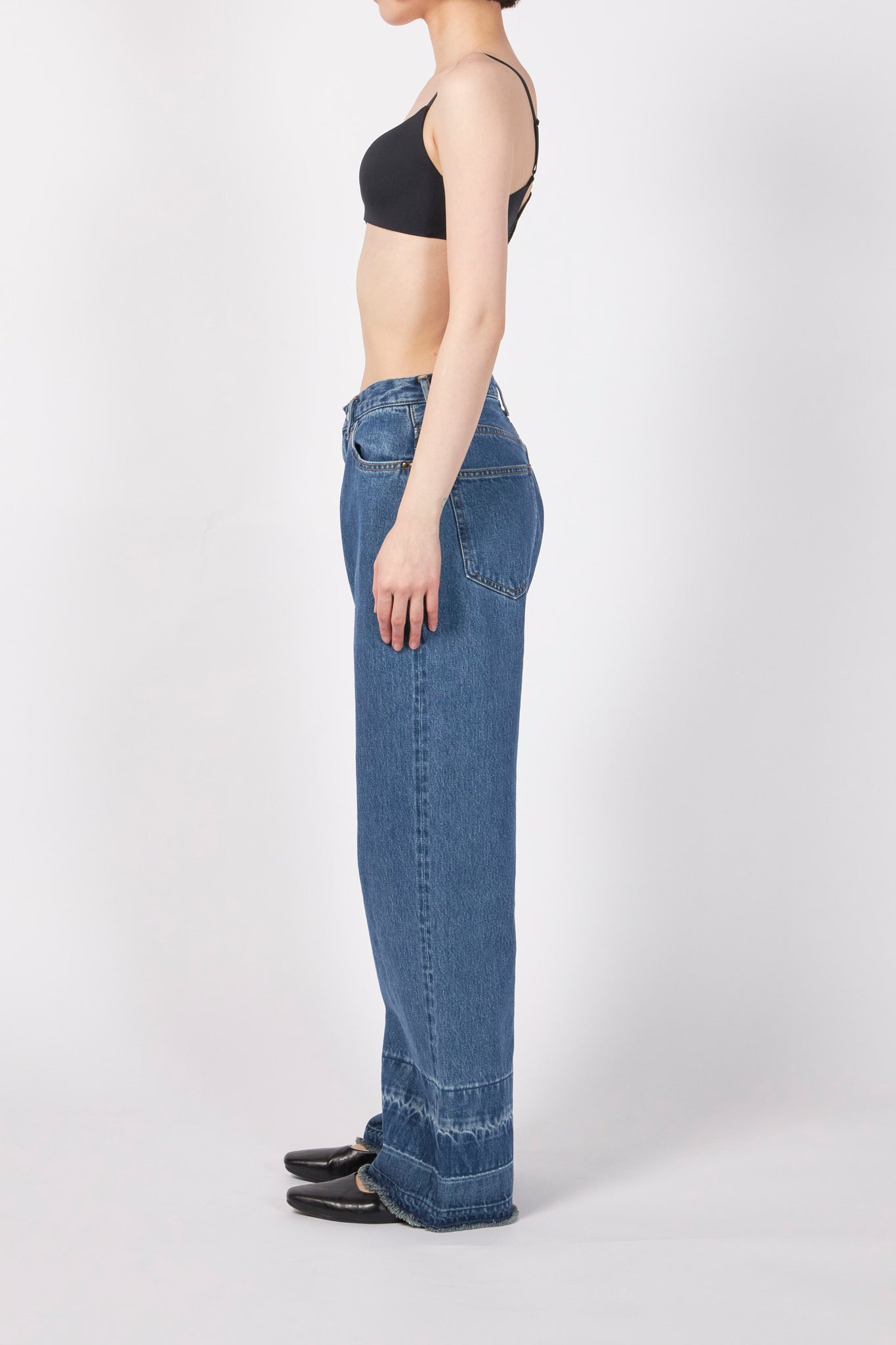 腰まわりからふんわりと広がるシルエットが女性らしさを引き立てるデニムパンツ。