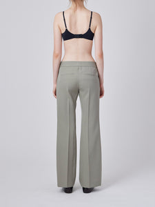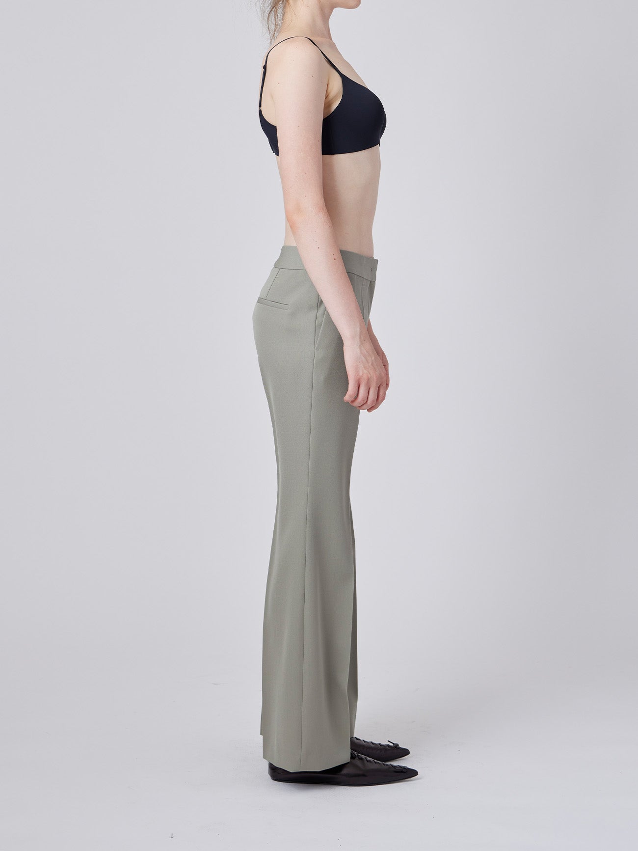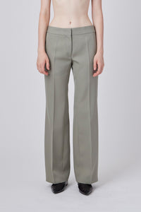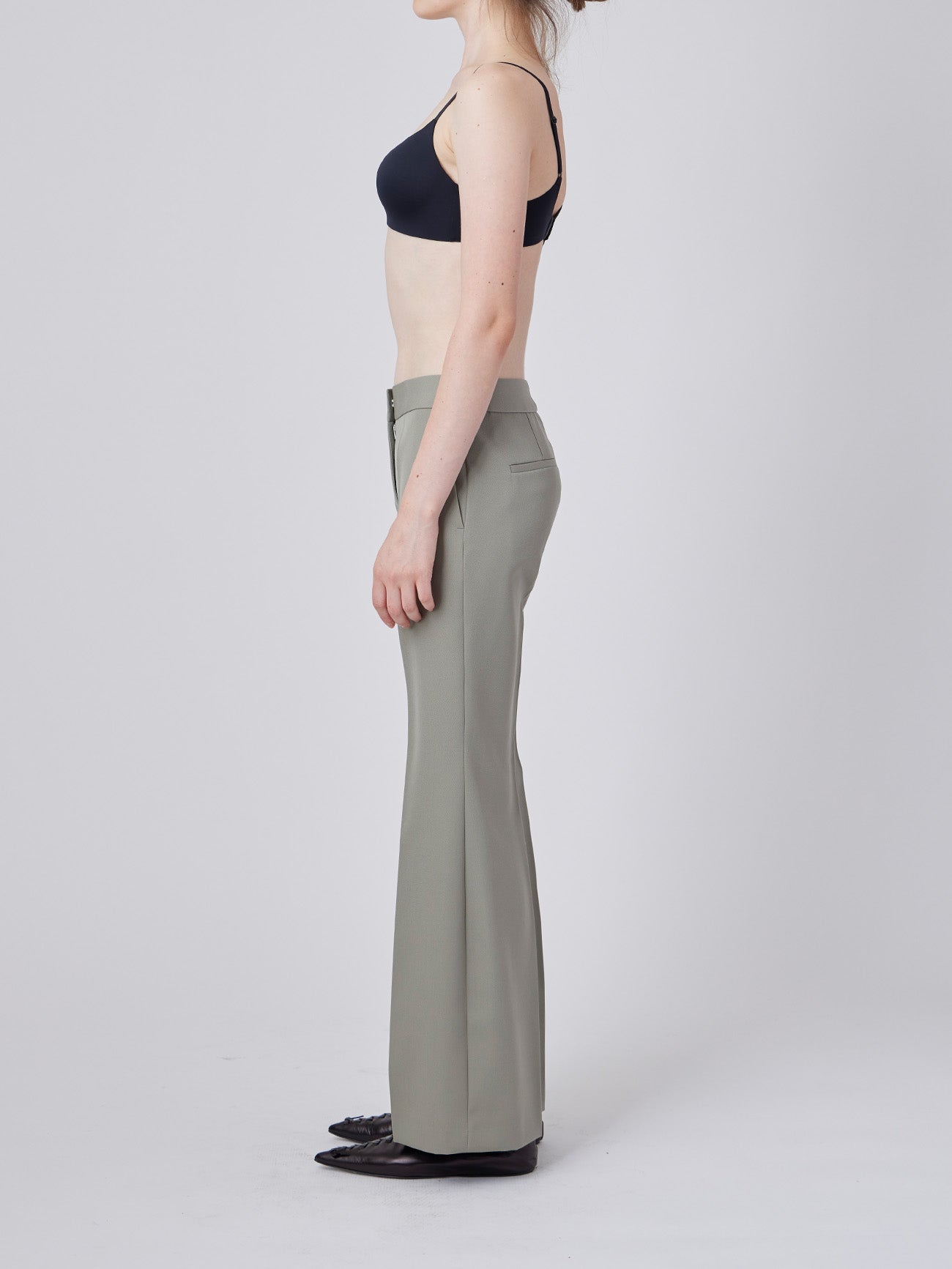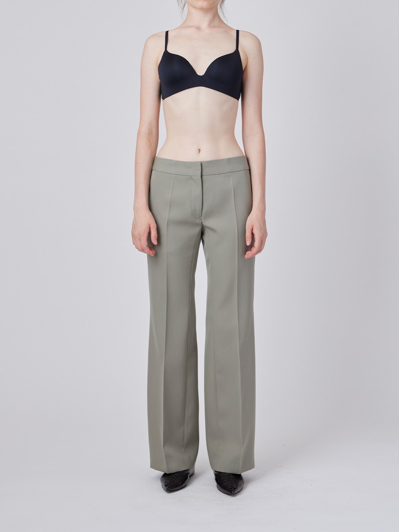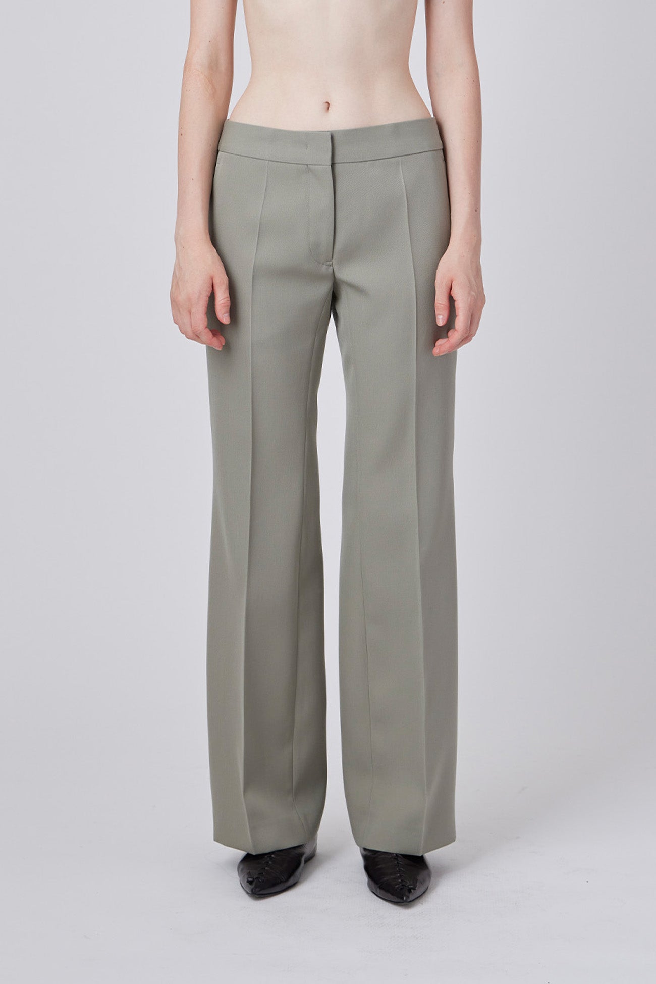 股上がミッドライズに作られており、ウエスト位置が一般的なものより、やや下目に設計されています。シンプルながらも腰元から伸びたセンタープレスは足元のラインを綺麗に彩り、スッキリとした印象を与えます。