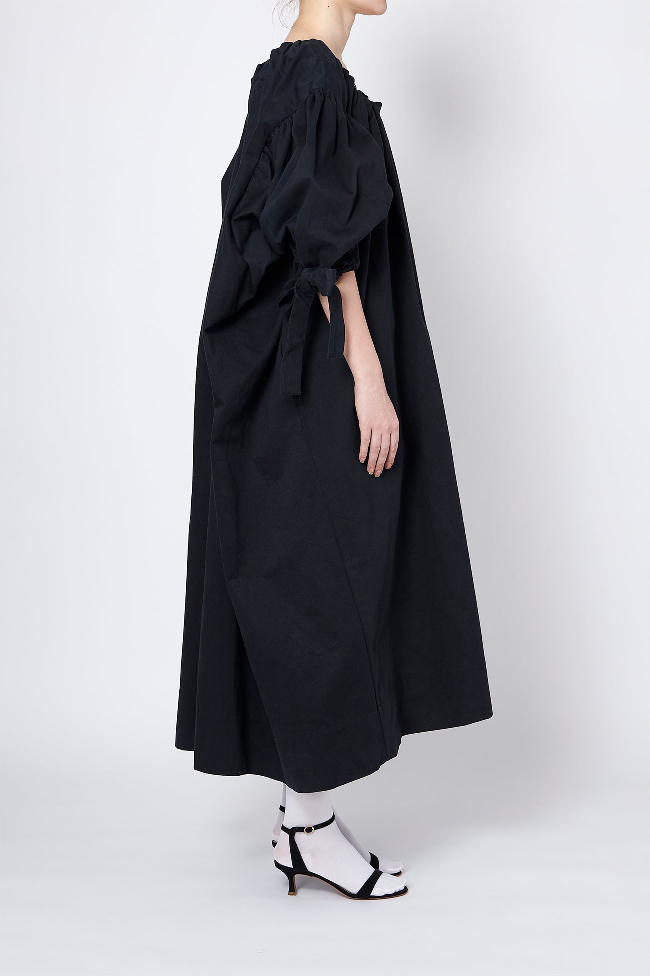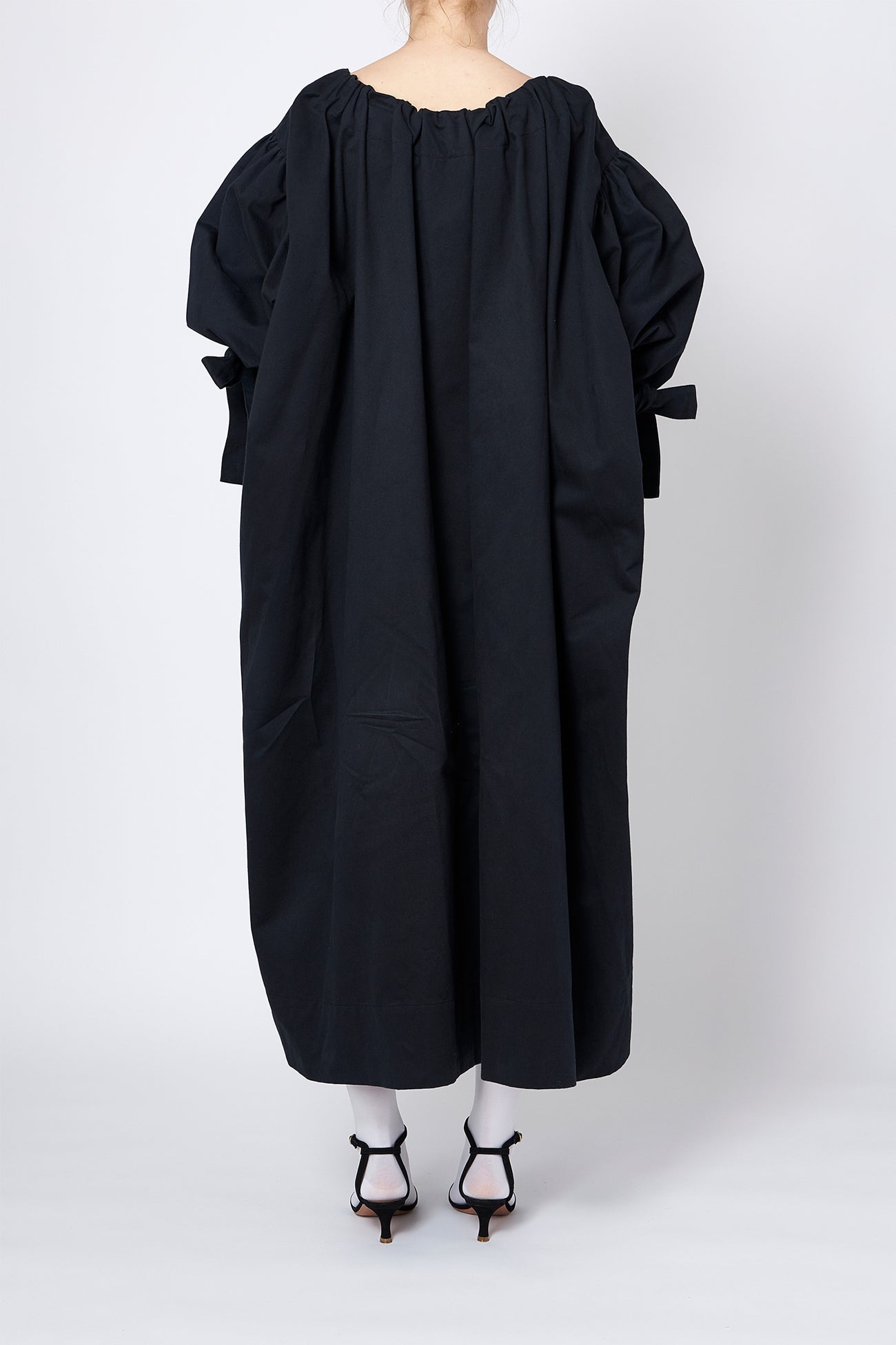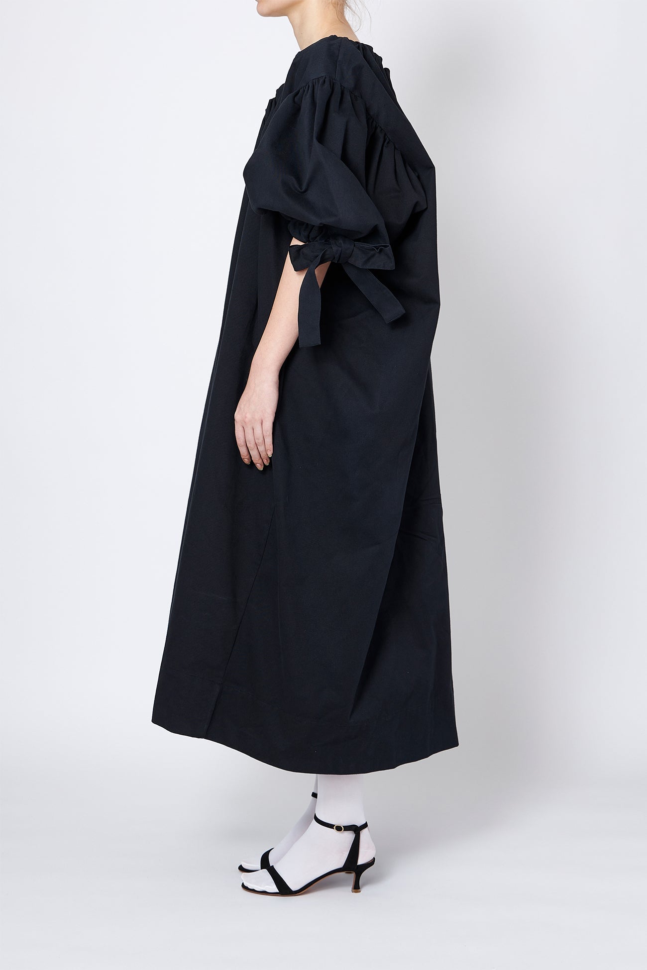 ラッフルバルーンスリーヴがアイコンの、パリッと張り感のあるコットンポプリンミディドレス。