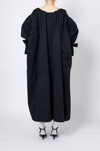 上品で優美なギャザーを寄せたボートネックラインと、ドロップショルダーのオーバーサイズシルエットが特徴。誇張されたラッフルトリムのバルーンスリーヴは、袖口のリボンで調整でき、ロマンティックなボリュームのあるフォルムが優しく華やかさを引き立たせます。