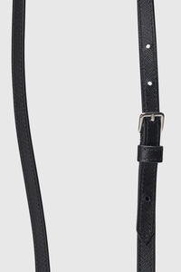 カーフレザーにメタリックのハードウェアディテールをあしらったデザインで、内側にミラーも付いているミニマルながら機能的なバッグです。