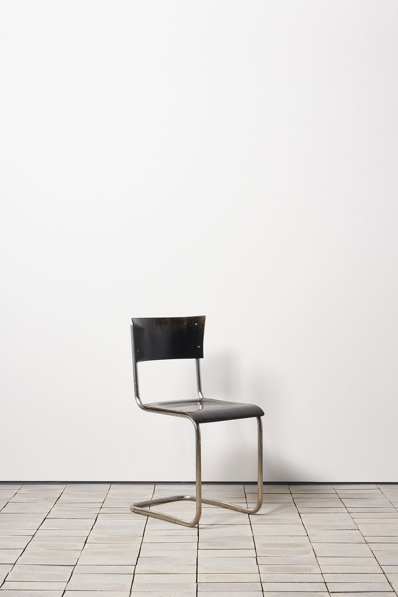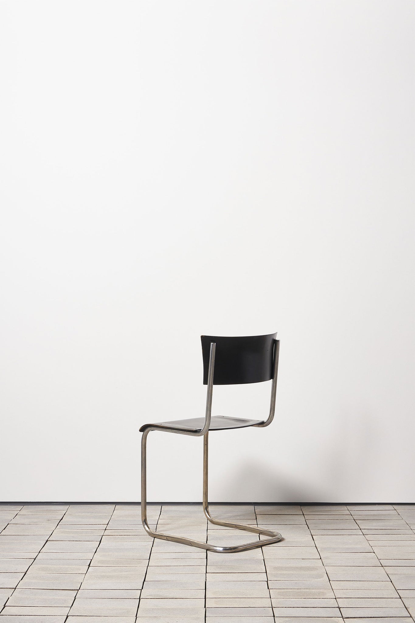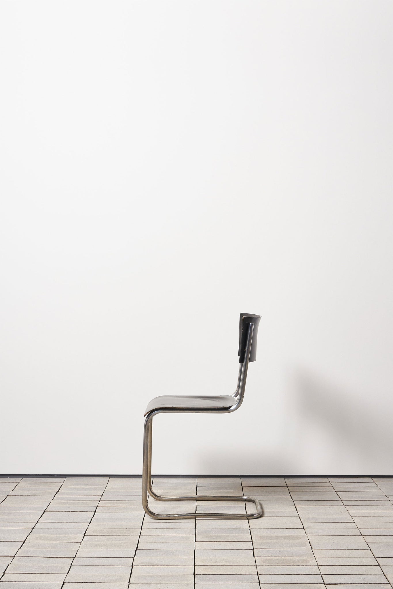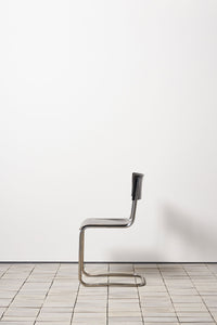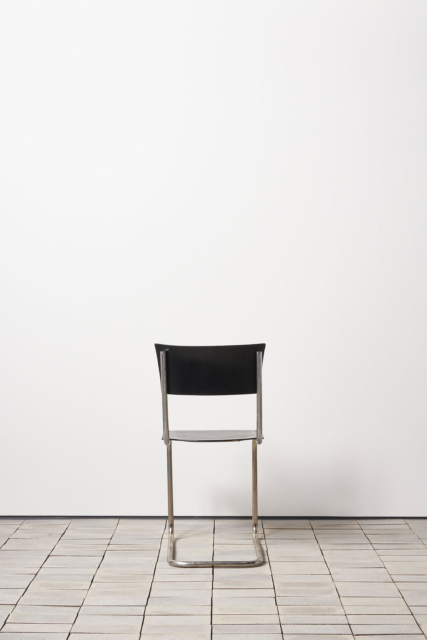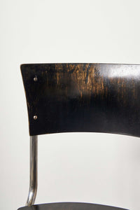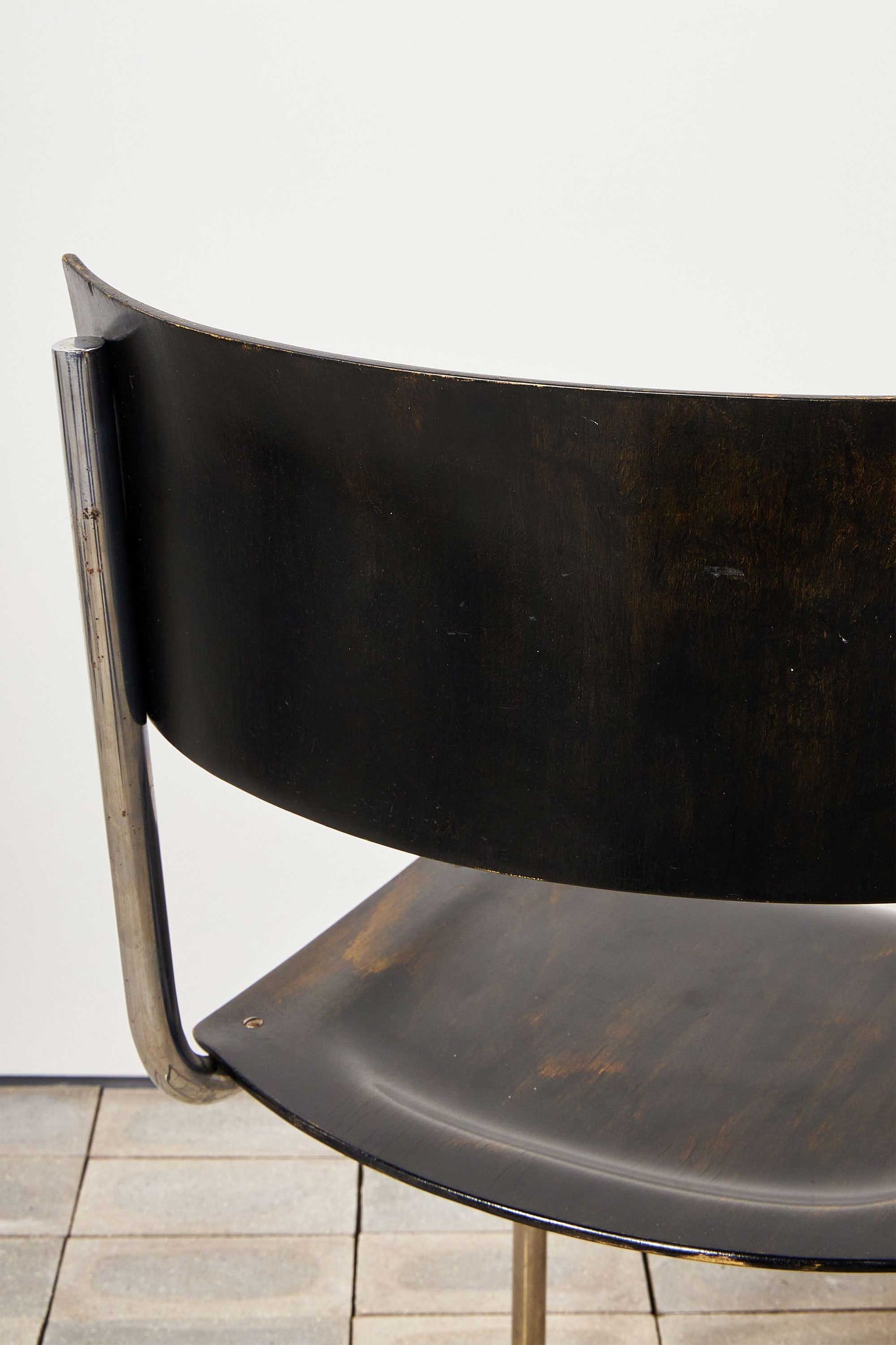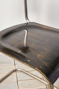 オランダ人建築家マルト・スタムのデザインによる、黒い木製の座面と背もたれのあるスチール製パイプ椅子。初期の製造品です。