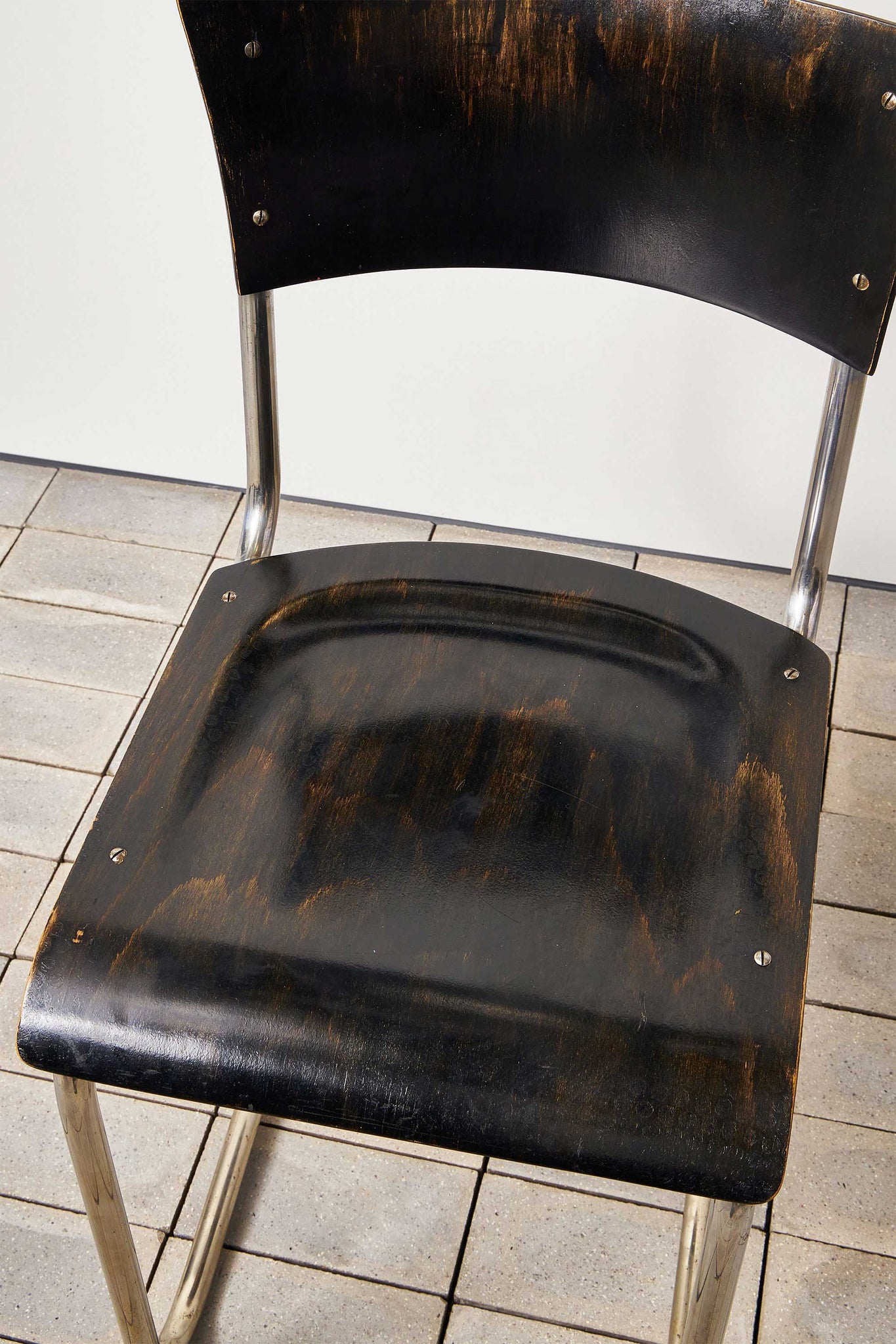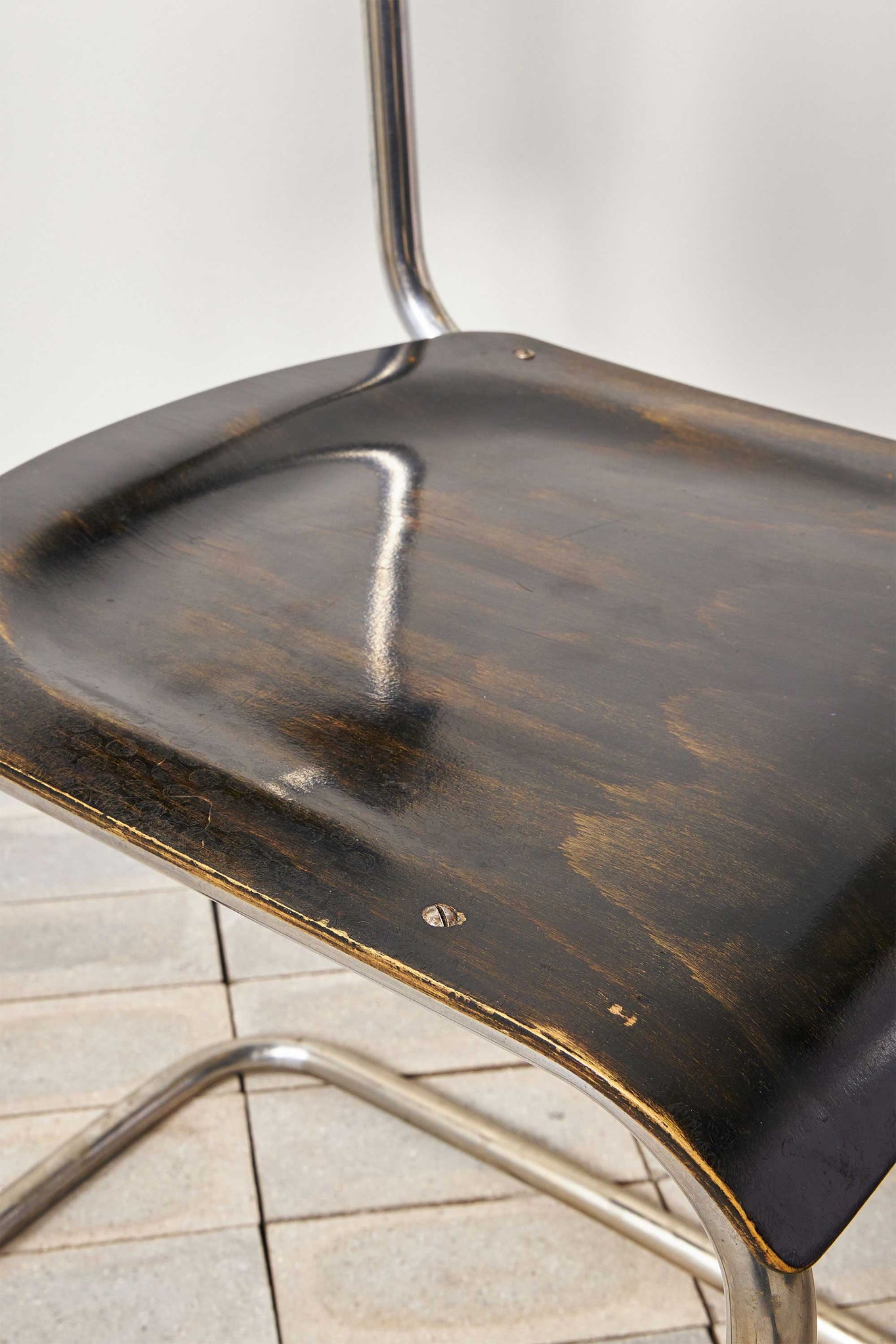 Tubular steel cantilever chair with a black wooden seat and backrest designed by Dutch architect Mart Stam, manufactured in 1939 by the legendary Mücke-Melder in Czech. Early production piece.