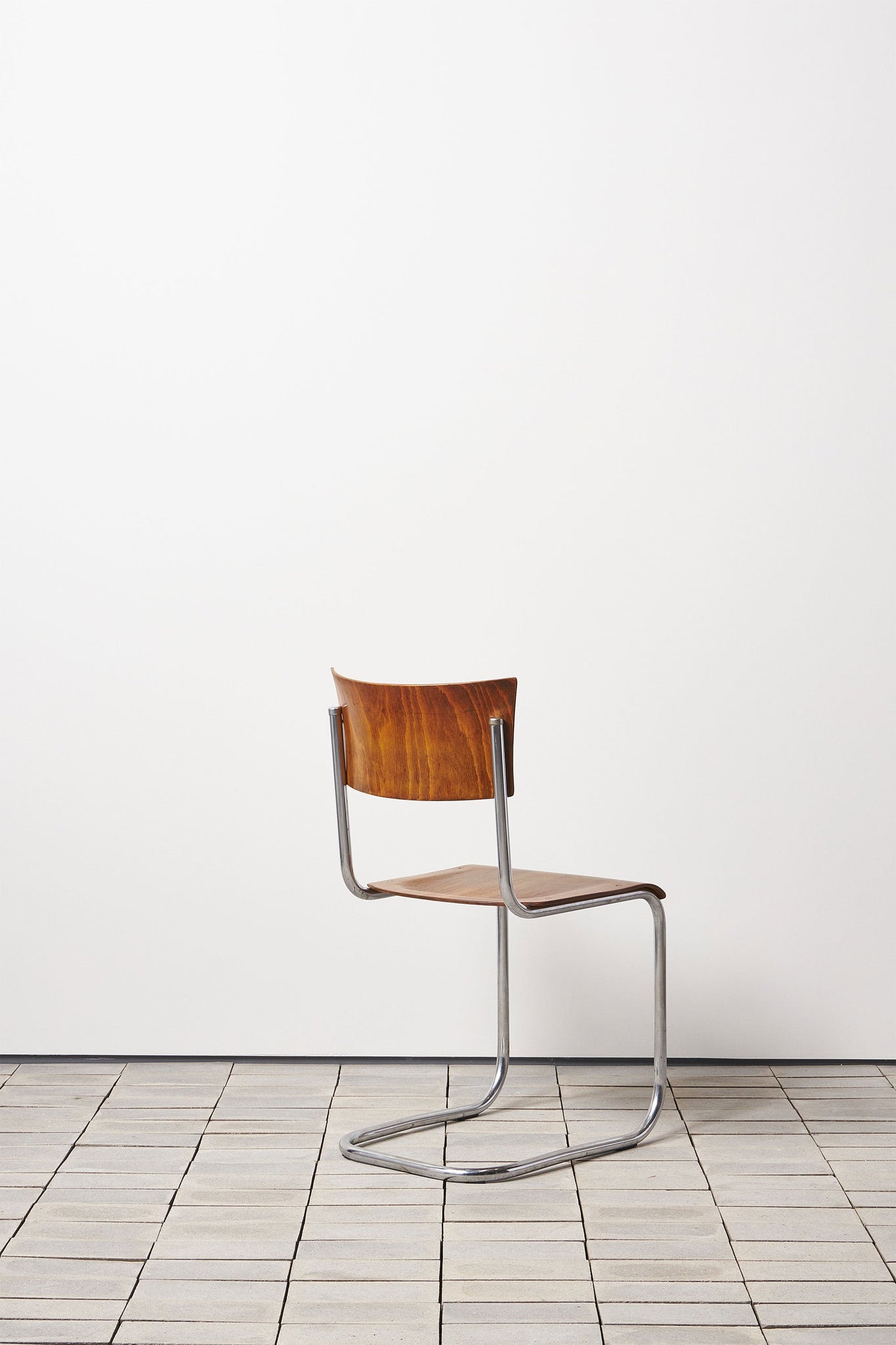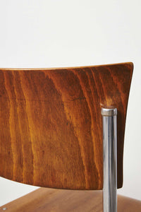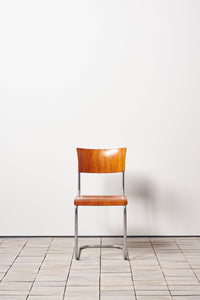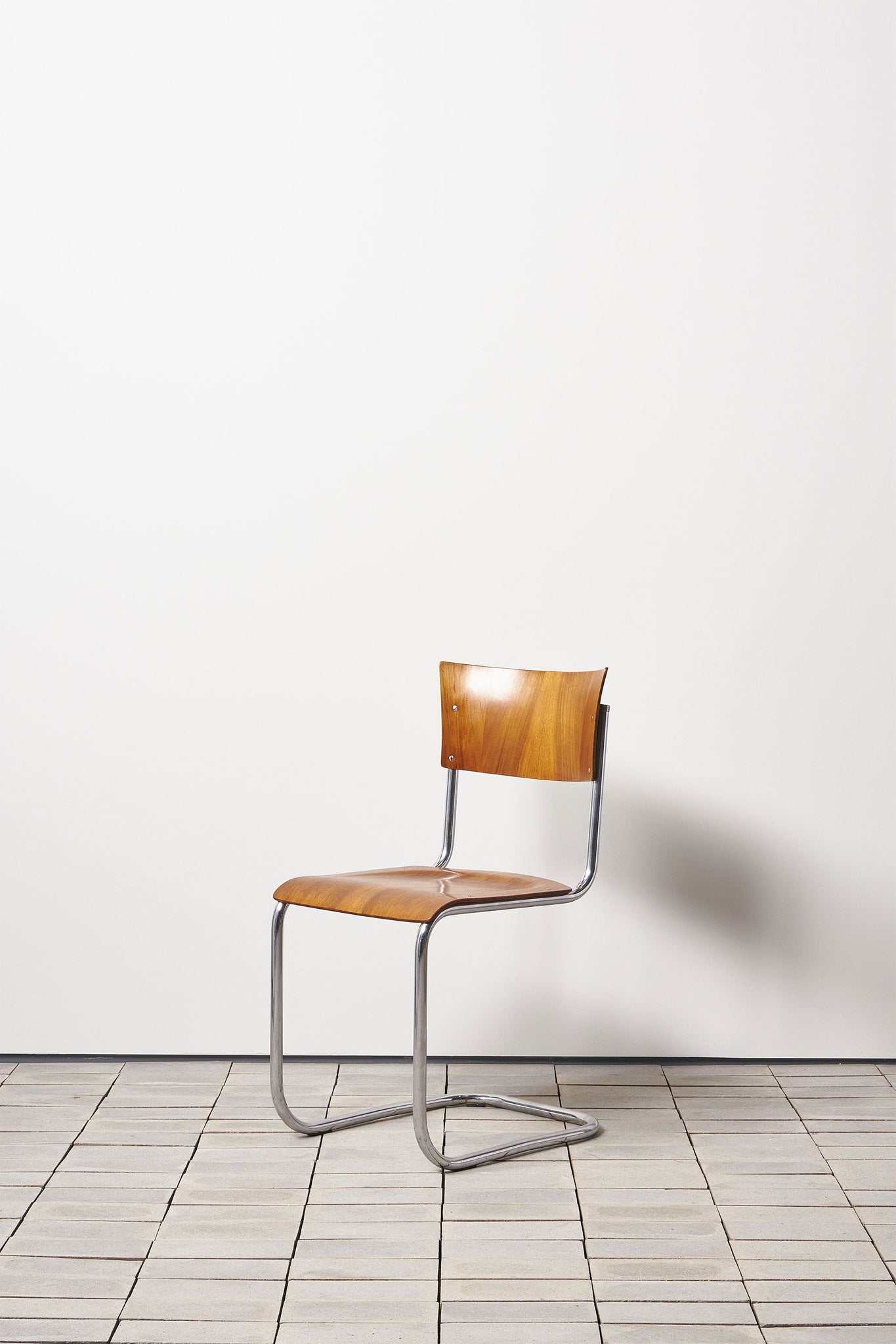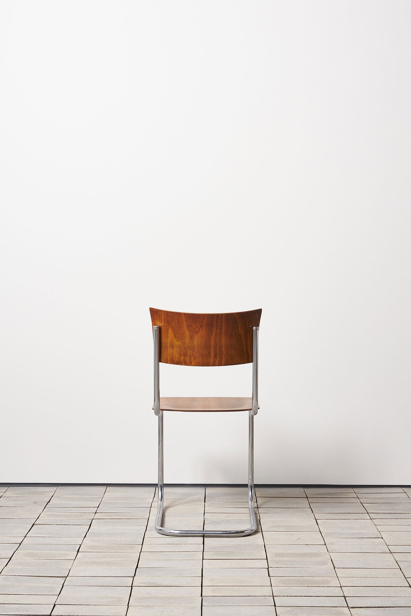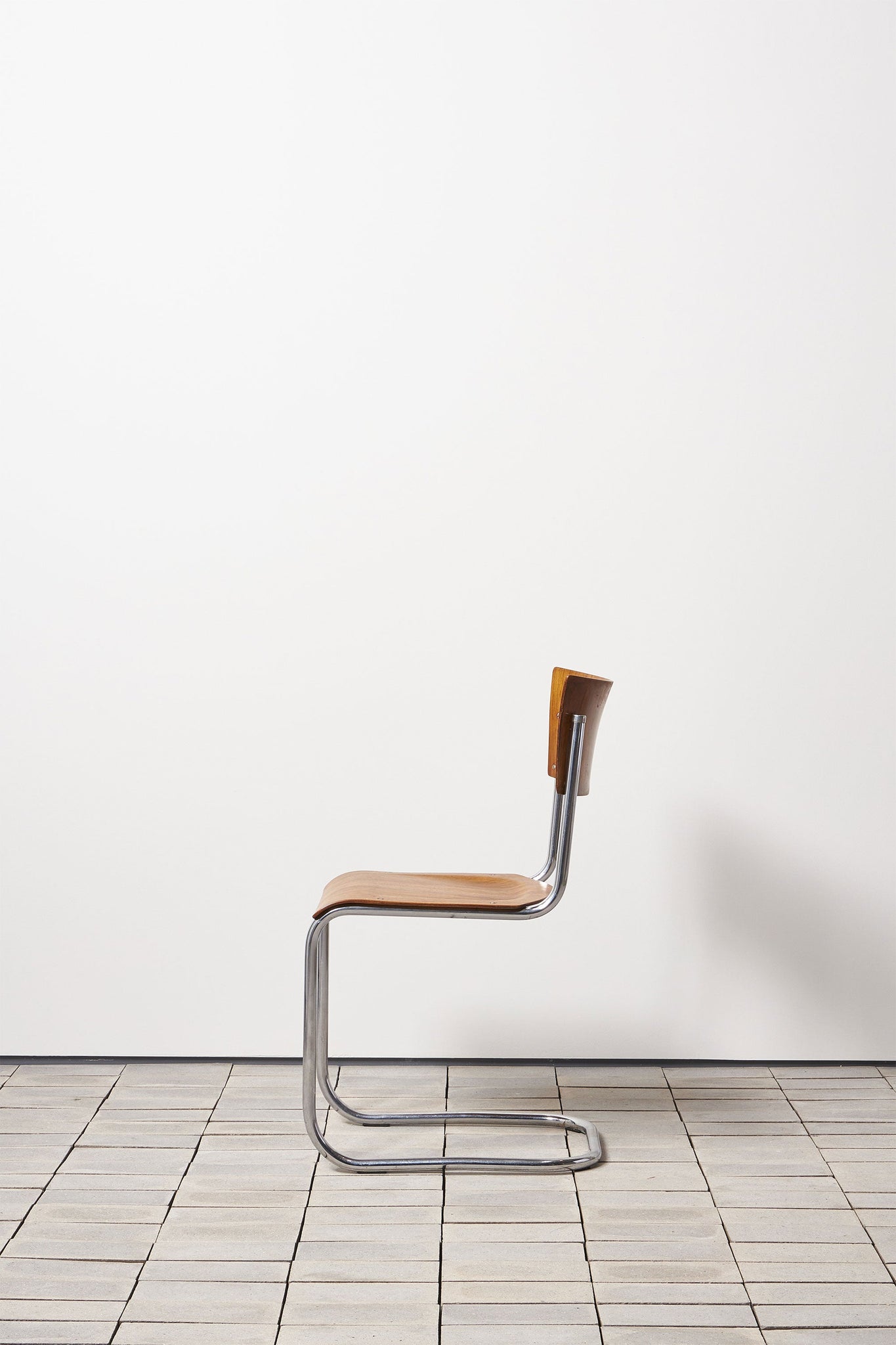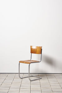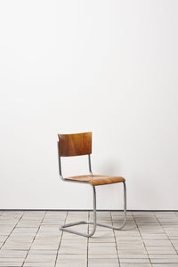 オランダ人建築家マルト・スタムによるデザインで、1935年にドイツのゲブルダートーネット社によって製造された、フレンチウォールナット材の座面と背もたれの付いたスチール製パイプ椅子。初期の製造品ならではの、美しい木目が特徴的です。