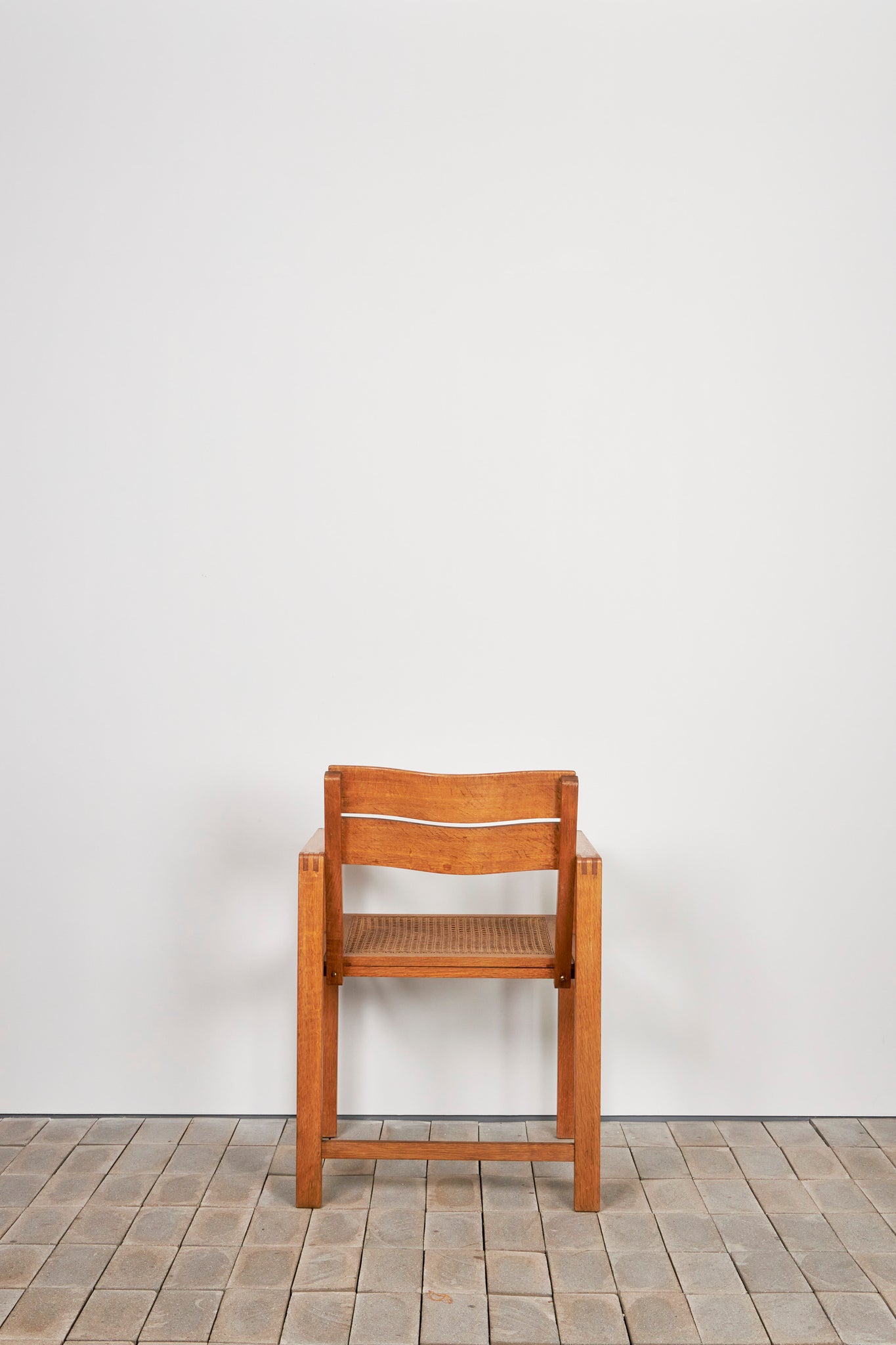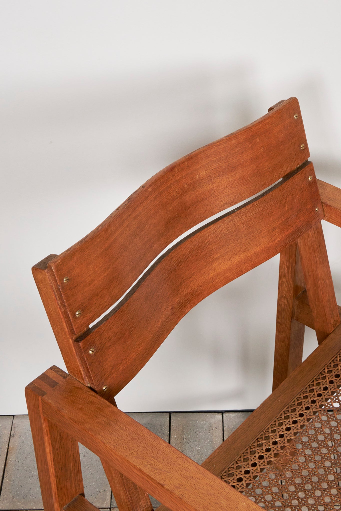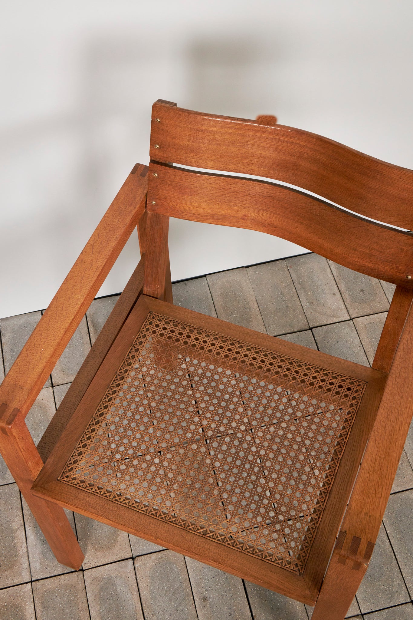 このアームチェアは、機能性と標準化の理念を体現するものであり、ディックマンの特徴である無垢材、籐編み、幾何学的な構造体が見て取れます。交差する線と面によって構成される軽やかで開放的なデザインは、1928年にマルセル・ブロイヤーが言及した通り、ディックマンの家具の魅力でもあります。