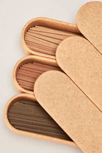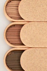 人知を超えた永く深い時間。静かな緊張感と湿度を持った空気。古い樹木が重ねてきた記憶が煙と共に立ち昇る。神代杉や沈香により、オークモスの重みが引き出されたスモーキーなウッドノート。何百年もの時を経た香木の天然精油を使ったインセンススティック。特別に作られた陶磁器のケースは、香を焚くという儀式的な振る舞いを意識させます。
